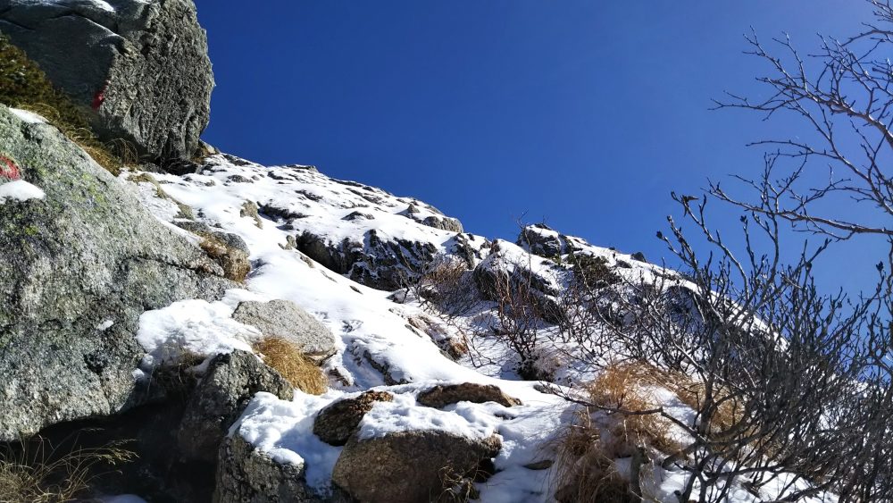 最後は直登ルート、一見すると難しい冬季の岩場。