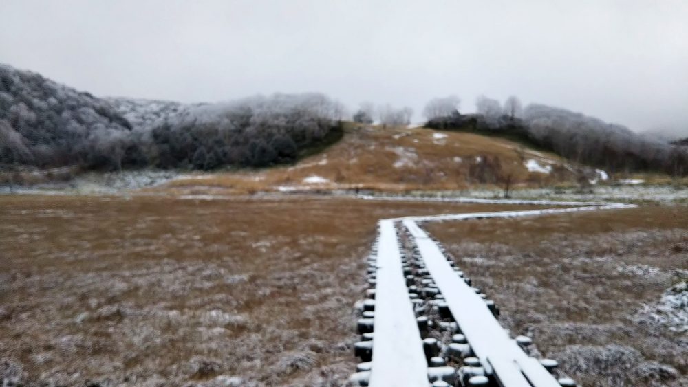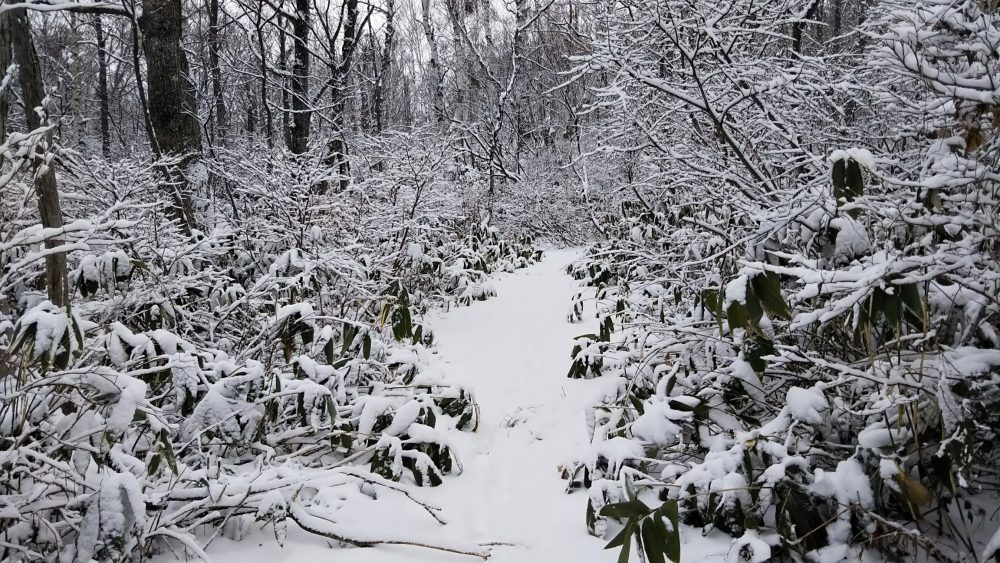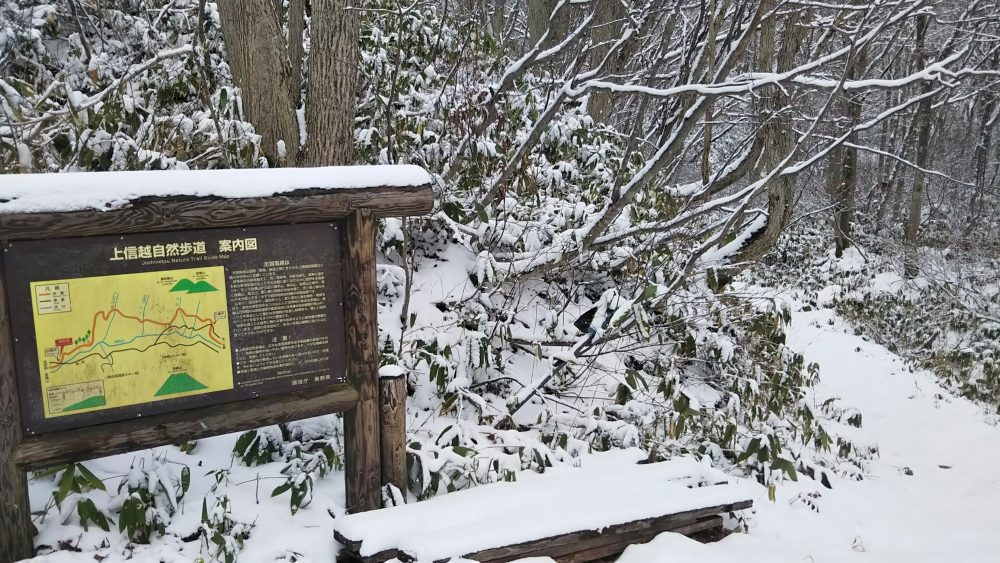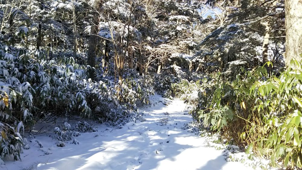 森の中のトレイルを進み、高度を上げていくと積雪10cmくらいのところも。