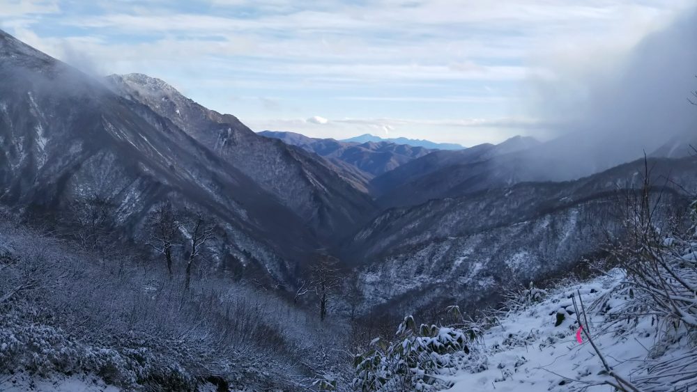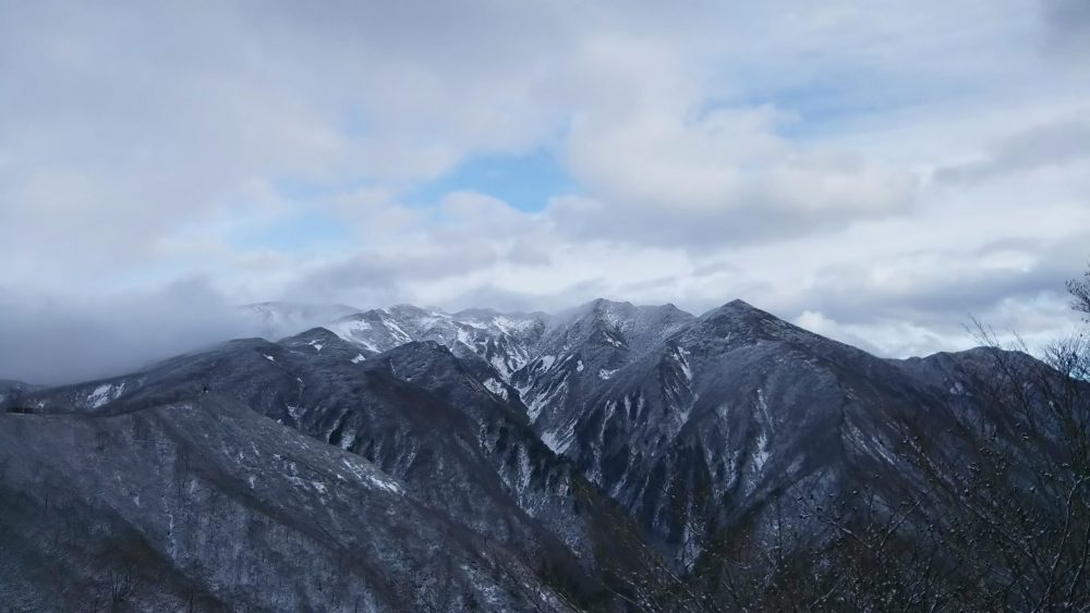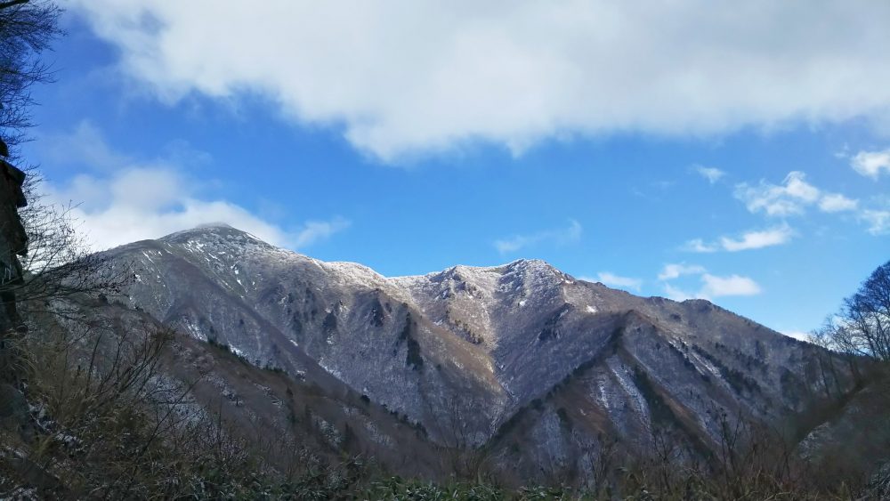 少し進み振り返ると一瞬の晴れ間から白毛門がくっきり。