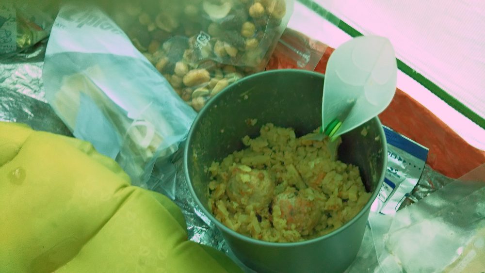 ビバークレーション1袋、スープ+カレー粉、鶏つくね1袋、チータラ40g、ミックスナッツ70gを食べて、水を多めに飲み、早々に就寝。