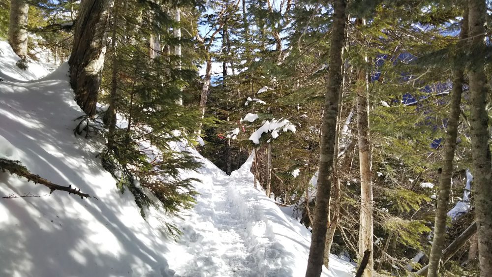 ここからはチェーンスパイクをつけて進みます。全部雪面で、一気に冷え込んだためか凍結箇所が多い。