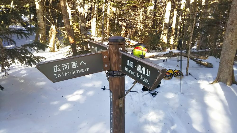 白鳳峠に着くとスノーシュー日和な感じの脛から膝までといったところ。