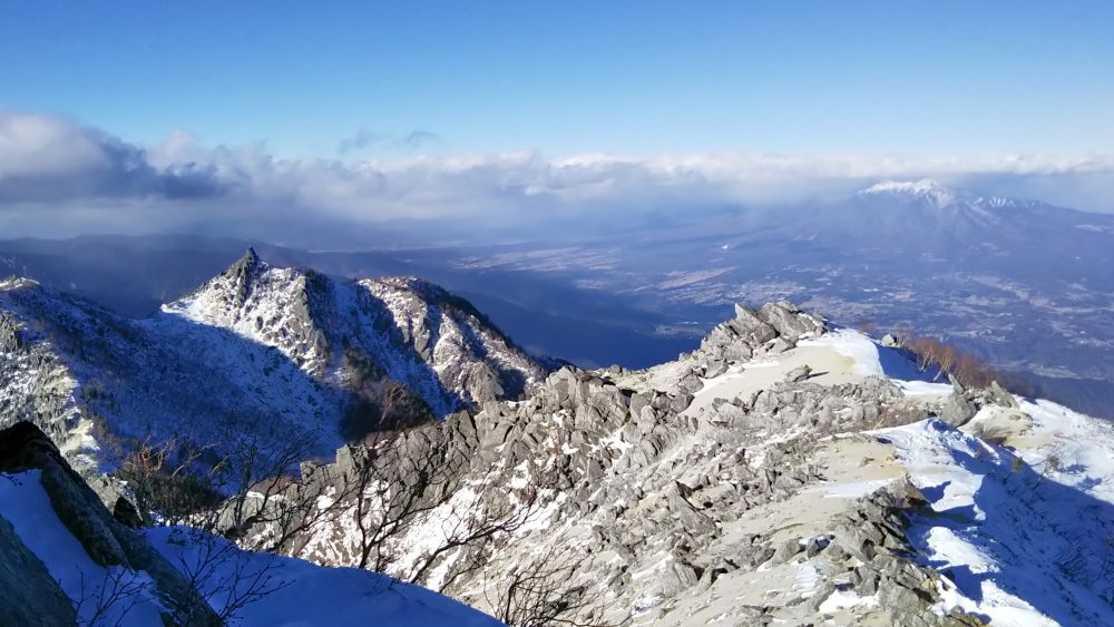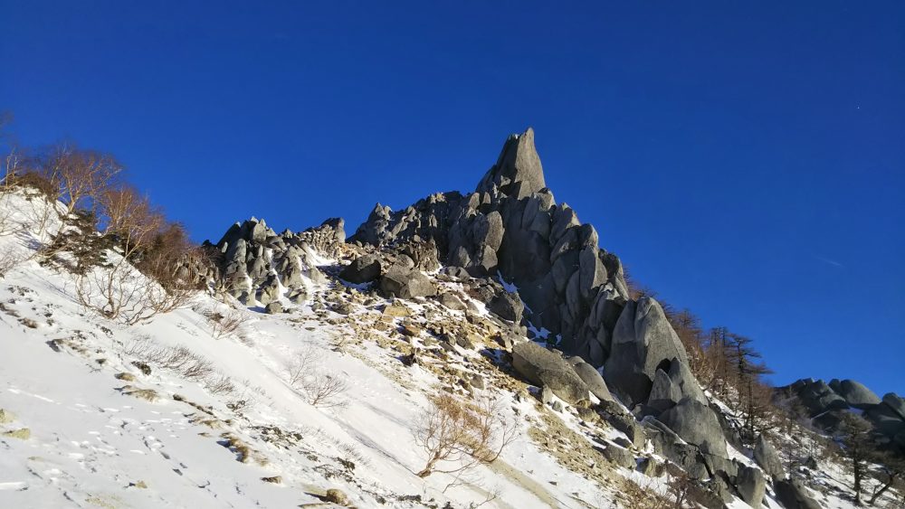 地蔵岳への急登は雪がついていたりザレていたりで不安定、風が強いなかなんとか上がっていきオベリスクへ到着。