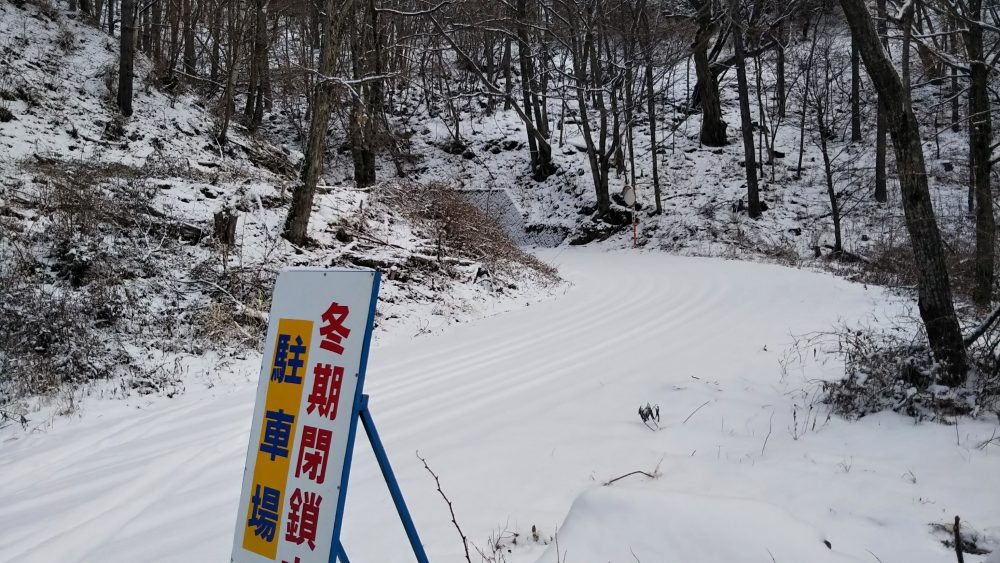 7kmほどで無雪期の駐車スペースまで着くとさすがにけっこう積もってます。