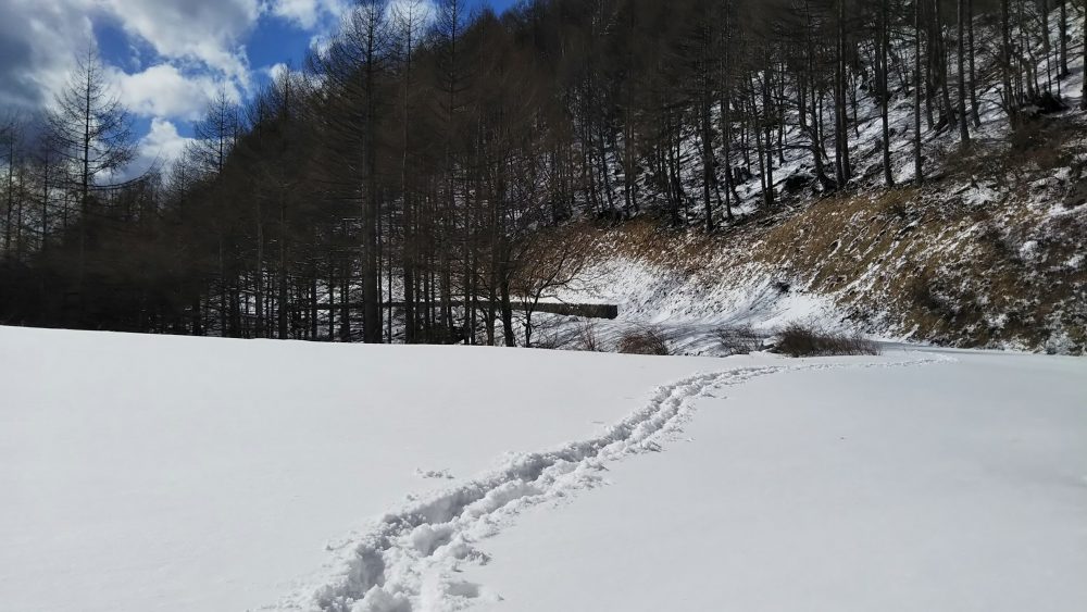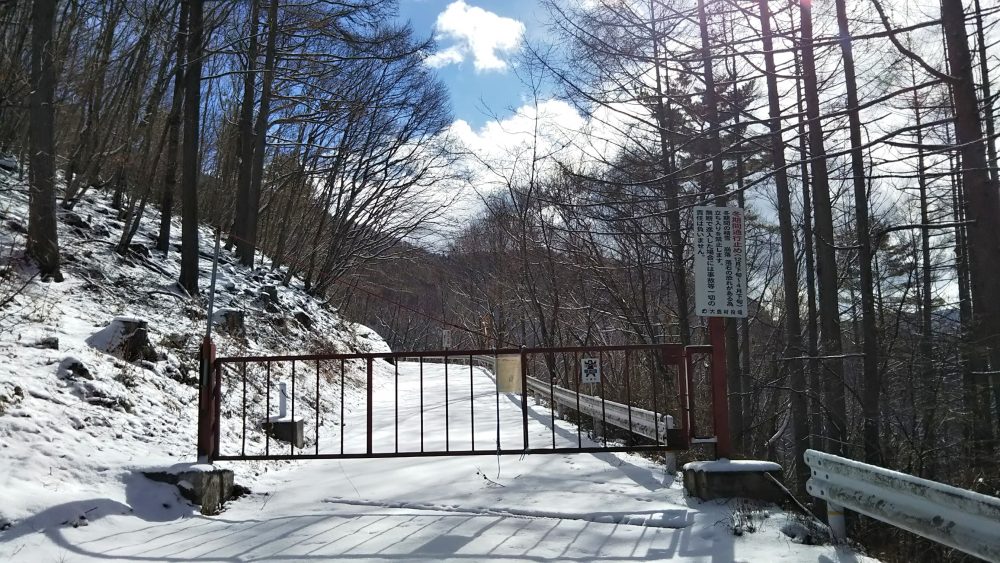 前夜はかなり雪が降り、林道は雪道でチェーンを使わずギリギリでした。