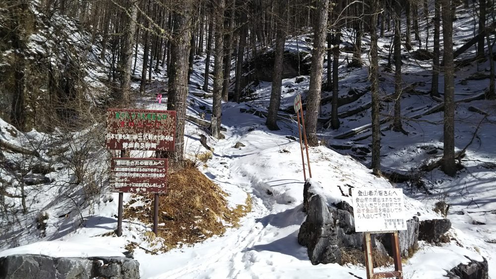 さらにゲートを越えて、鹿のトレースを所々たどりながら雪道を進むと鳥倉登山口に到着。