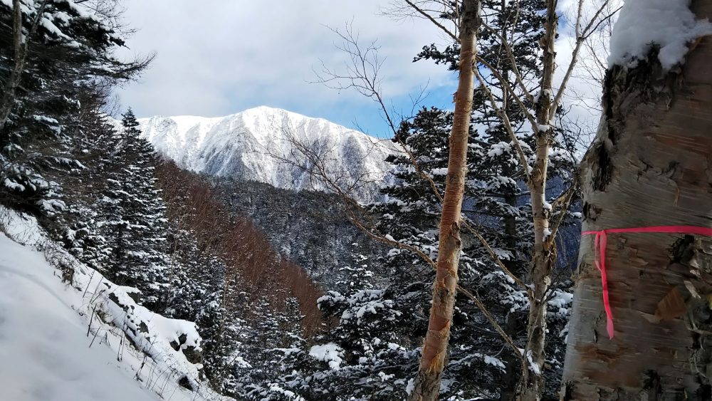 慎重に山側にトレースをつけながら進み、谷の通過部分は小規模な雪崩に気をつけながら一歩ずつ。