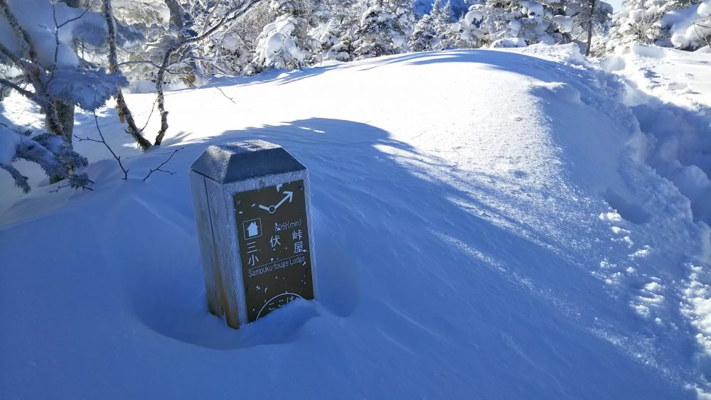 10分の5くらいからは雪が多くなりスノーシュー、徐々にペースが落ちてきます。