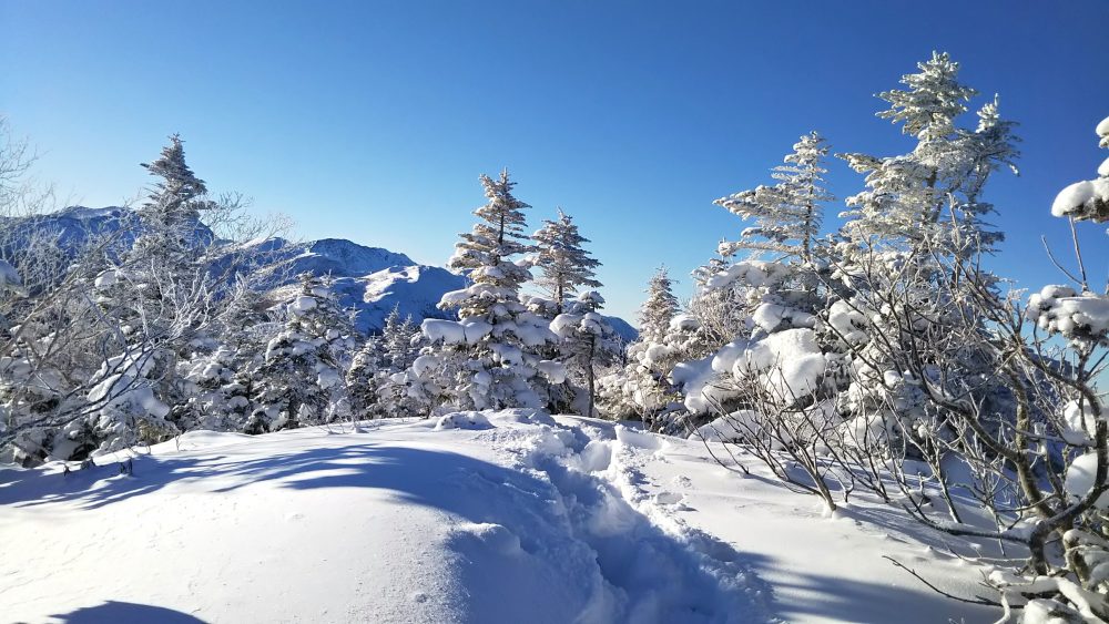 登山道は最初はそれほど積もっておらず、ツボ足で。