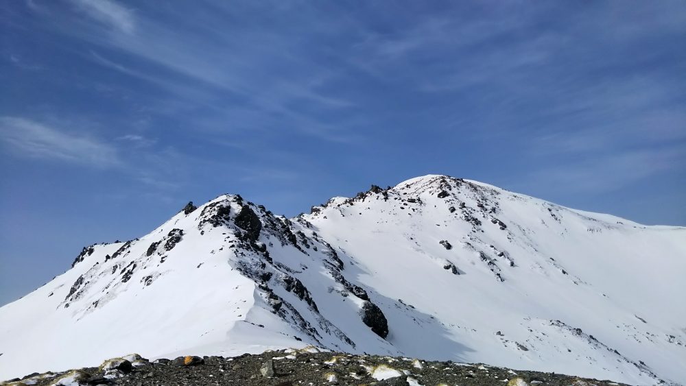 悪沢岳はそれほど難しくなく、夏は通れないようなルートを進むことができあっという間に着きます。
