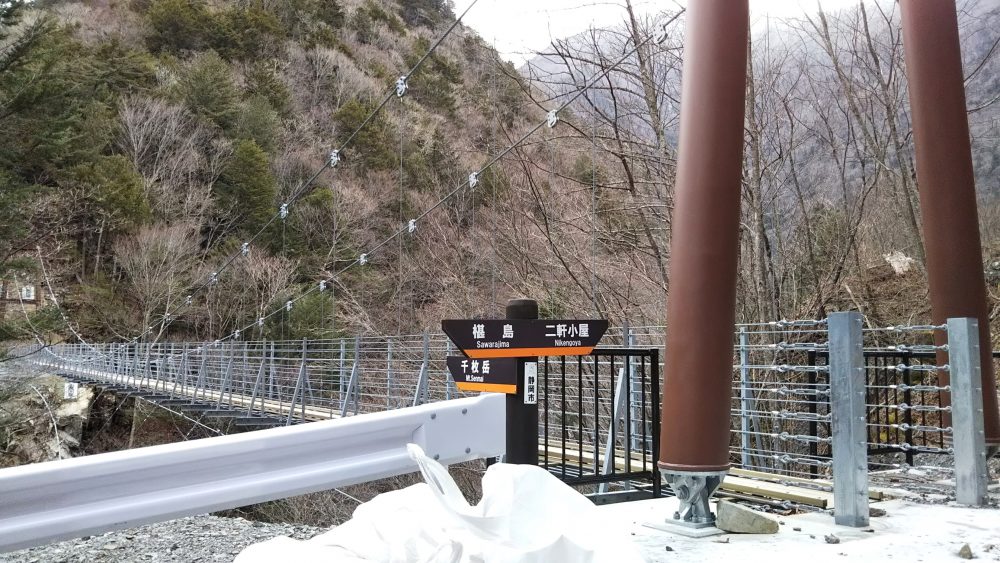 少し進むと新しい吊り橋と道標が立ってます。