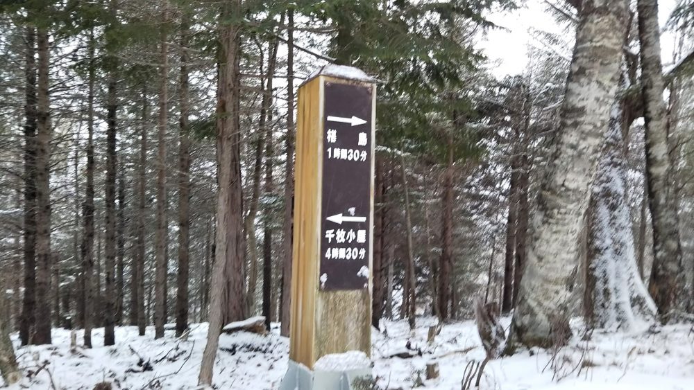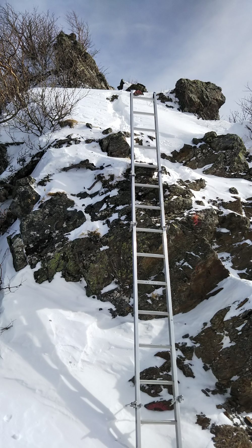 夏道では「×」がついているところを冬は進むので慎重に。新雪もついているので、基本動作を忠実に。ハシゴもあります。