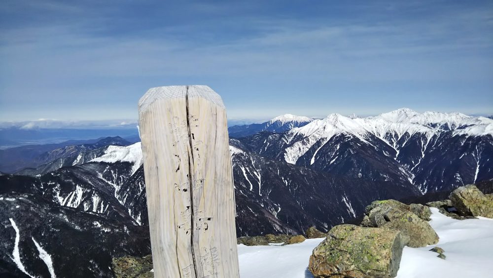 中岳山頂からは塩見岳方面が素晴らしい。遠くに仙丈ヶ岳も。