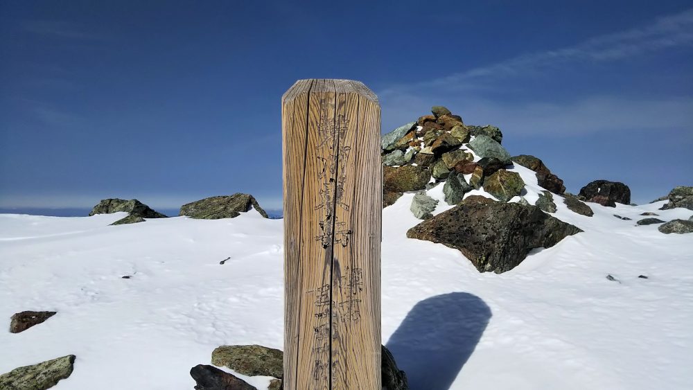 バラクラバを2枚被っていても寒い。10分で前岳山頂へ。ちょうど4時間。