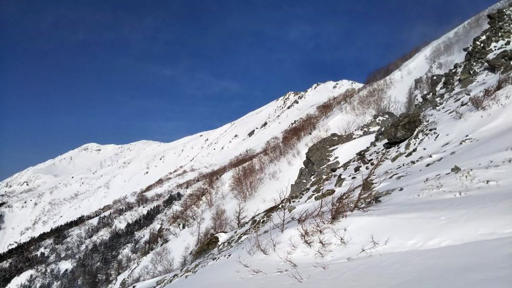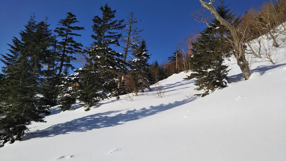 ここは夏道のトラバースが使えず、ダイレクトに降りるのですが、今なら絶対降りないような急傾斜のところを下りました。