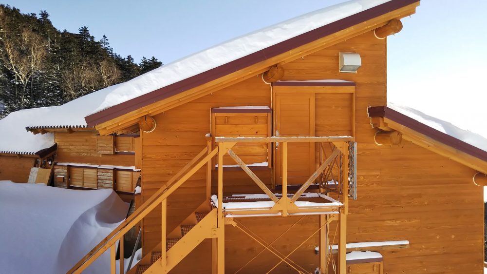 中岳避難小屋の目の前は強風で雪がほとんど無し。2シーズン前の年始よりも少ない。