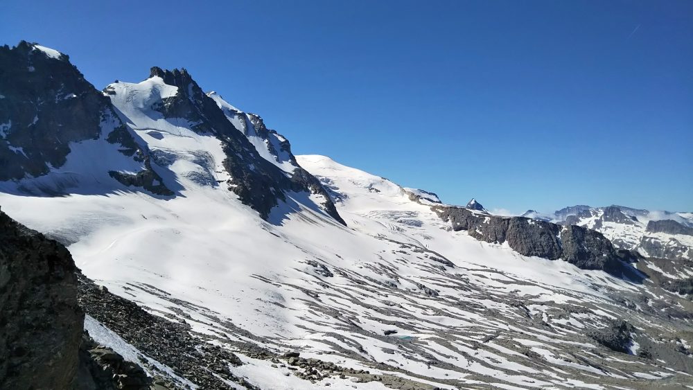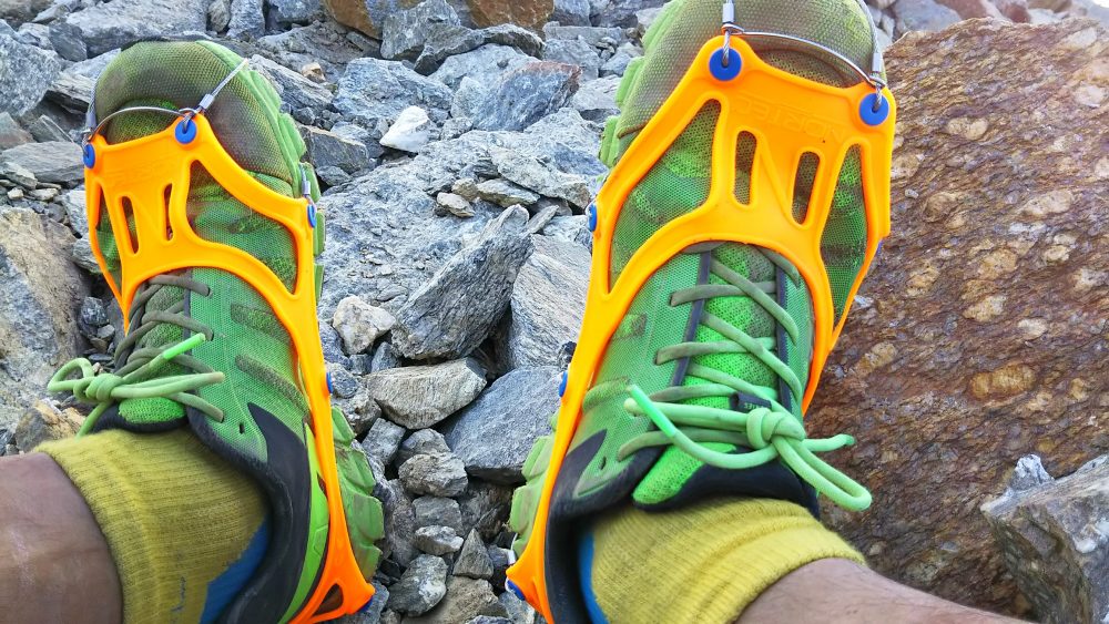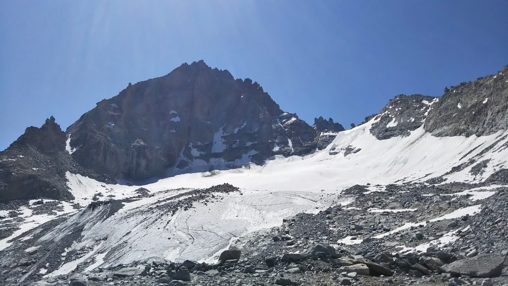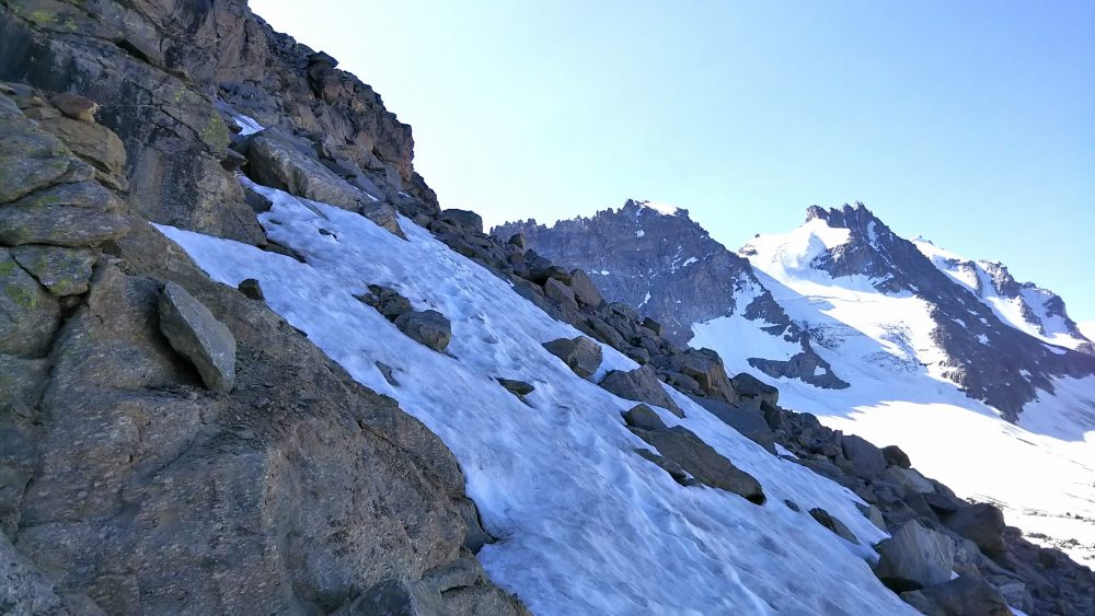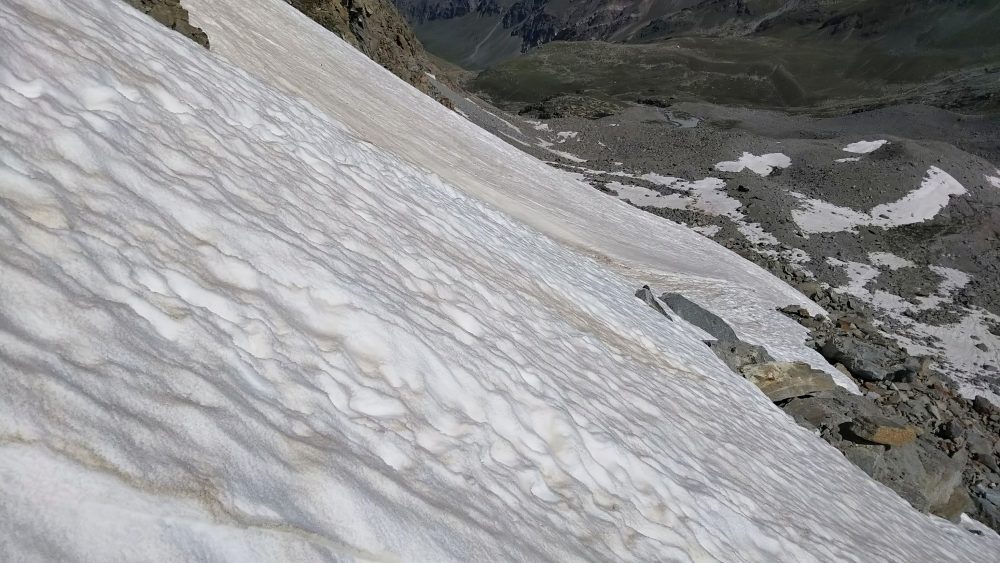 7月半ば、まだまだ雪が残っていて、3,100mからは朝の日陰はツルツルに凍結。