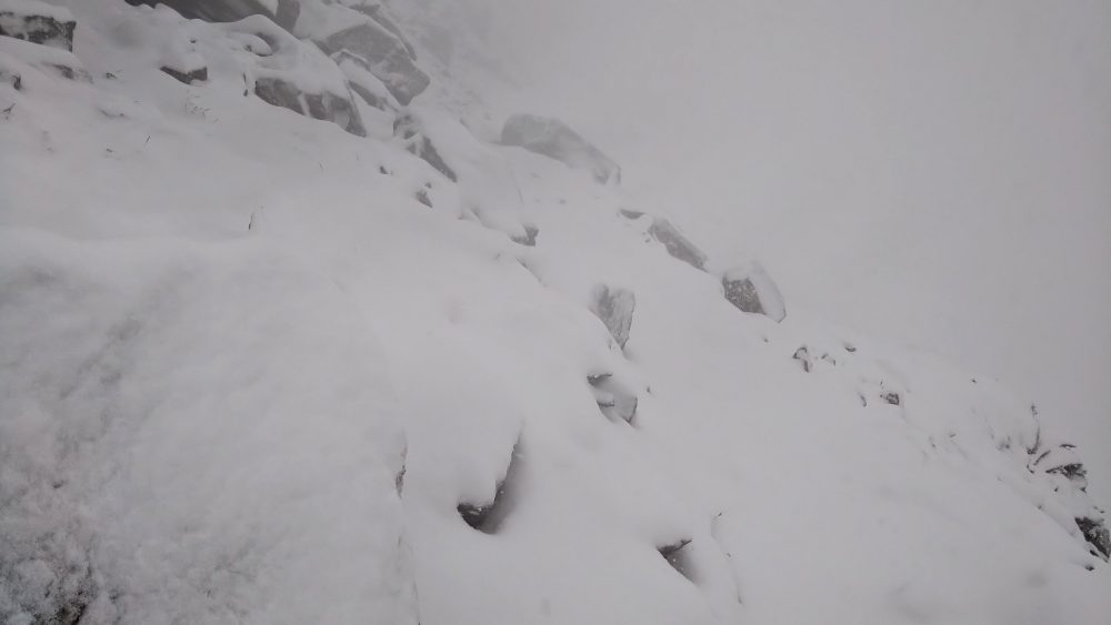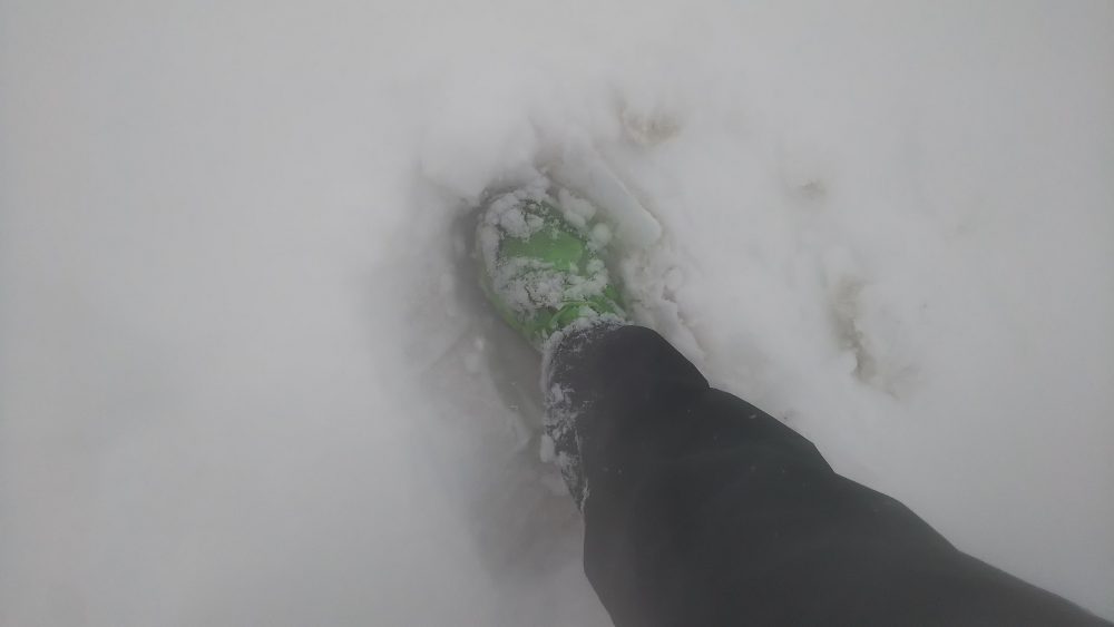 雪がやむ気配はなく、段々吹き溜まりもできてきて脛まで埋まるところも。