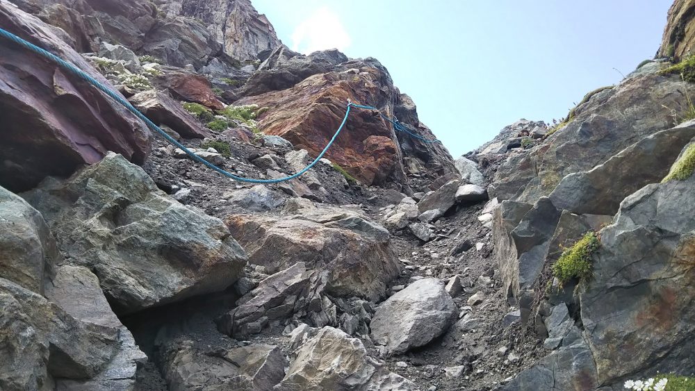 小屋からはさらに登りますがここが岩場、ロープありの要注意区間。