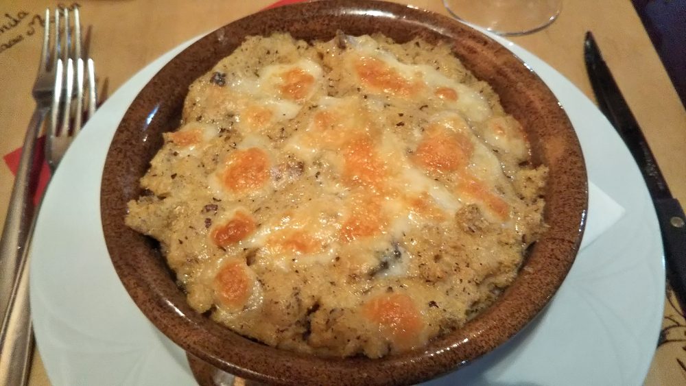 夕食は鉄板のチーズポレンタにピザにデザートをチョイス。