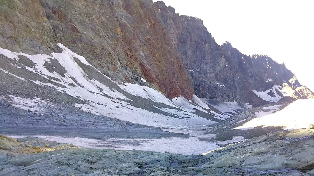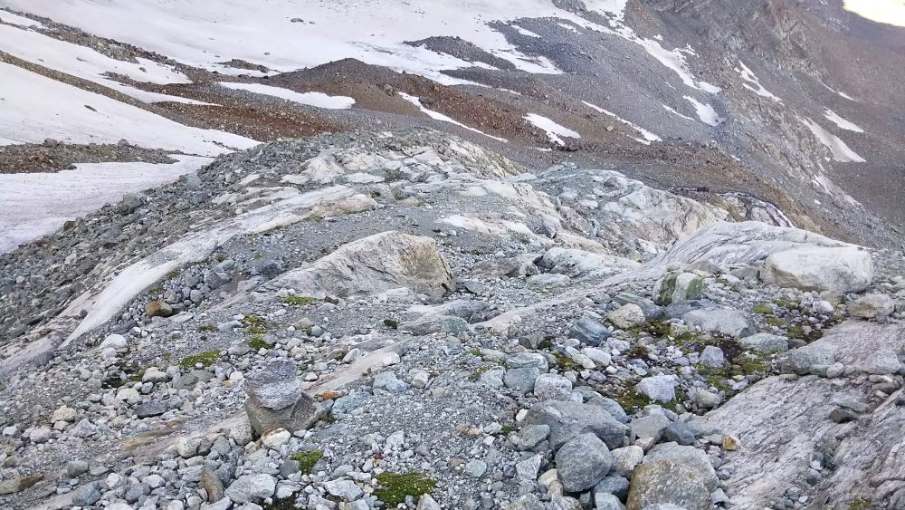 かなり急でガレていて、下りやすい場所を選んだら雪解け水がガンガン流れている沢みたいなところ。