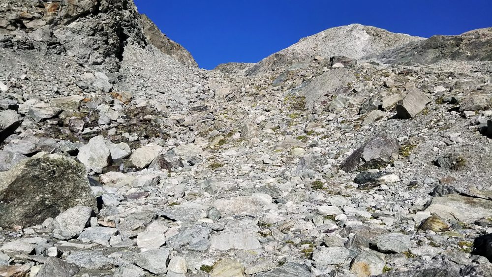 ガレ場でトレイルも不明瞭なトラバースで歩きにくく要注意です。