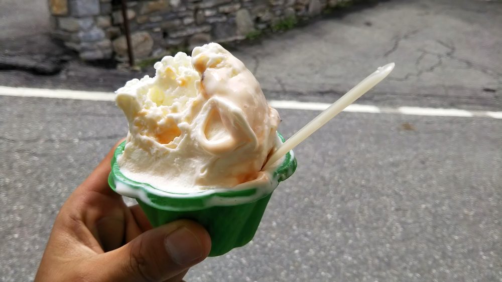 ゴール地点でジェラートを食べながらビショビショのシューズとソックスを乾かし、