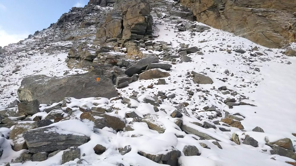 2日目の明け方、Col Planavalからのガレ場の下りで朝露が凍り、