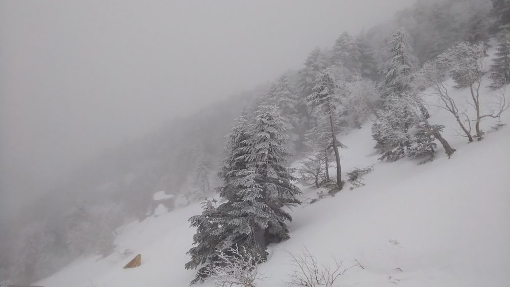 出発のころには雪が降り始め、1800mあたりからは登山道にも雪。