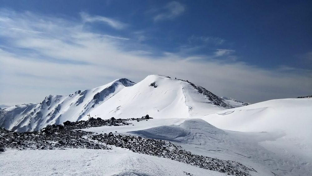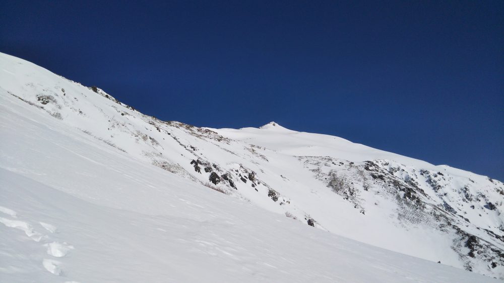 2650m付近からの尾根の直登は、新雪と下の固めの雪でなかなか難しいコンディション。