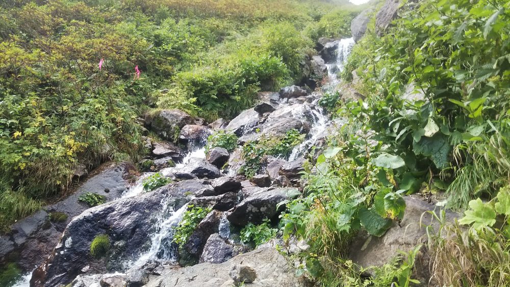 流れの少ない沢、巻き道、沢沿いにつけられたらトレイルを這い上がっていきます。