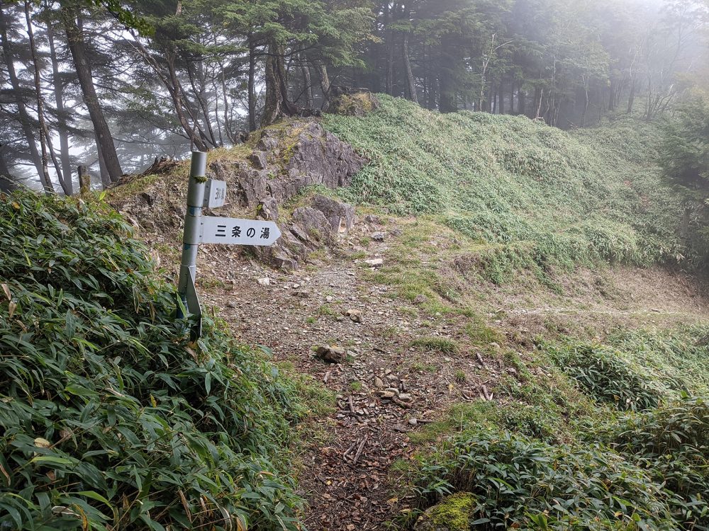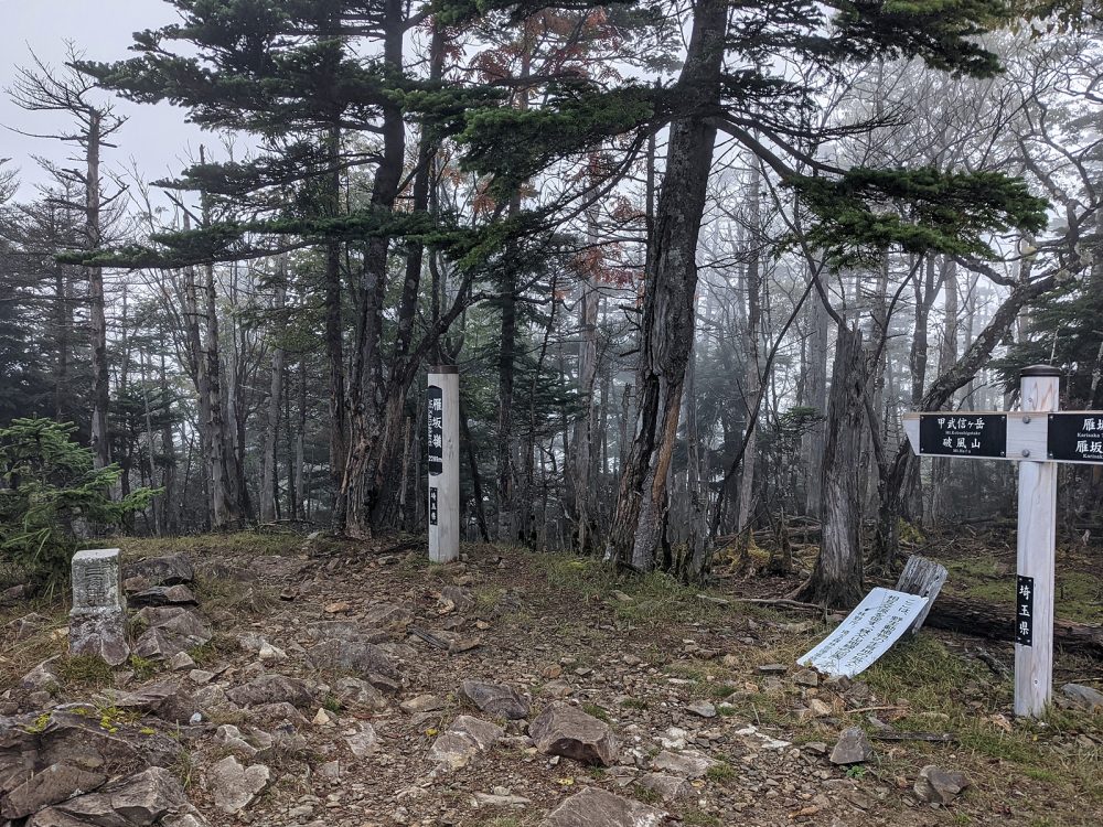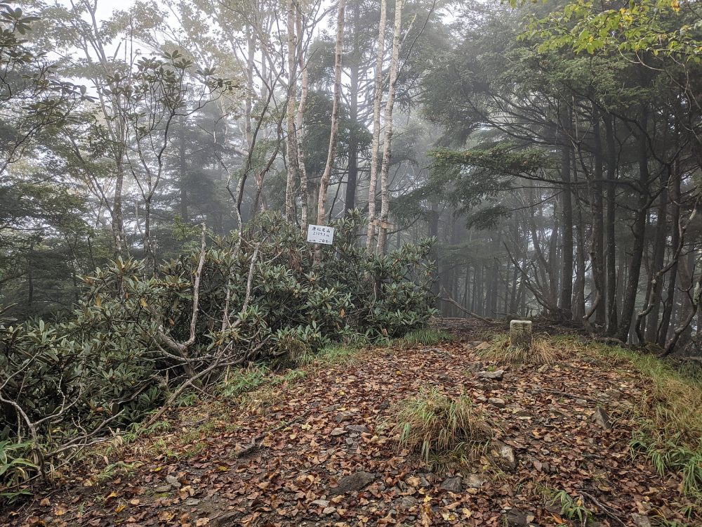三頭山の山頂に着いてもガスガスで視界1メートル。水浸しのトレイルを進み、