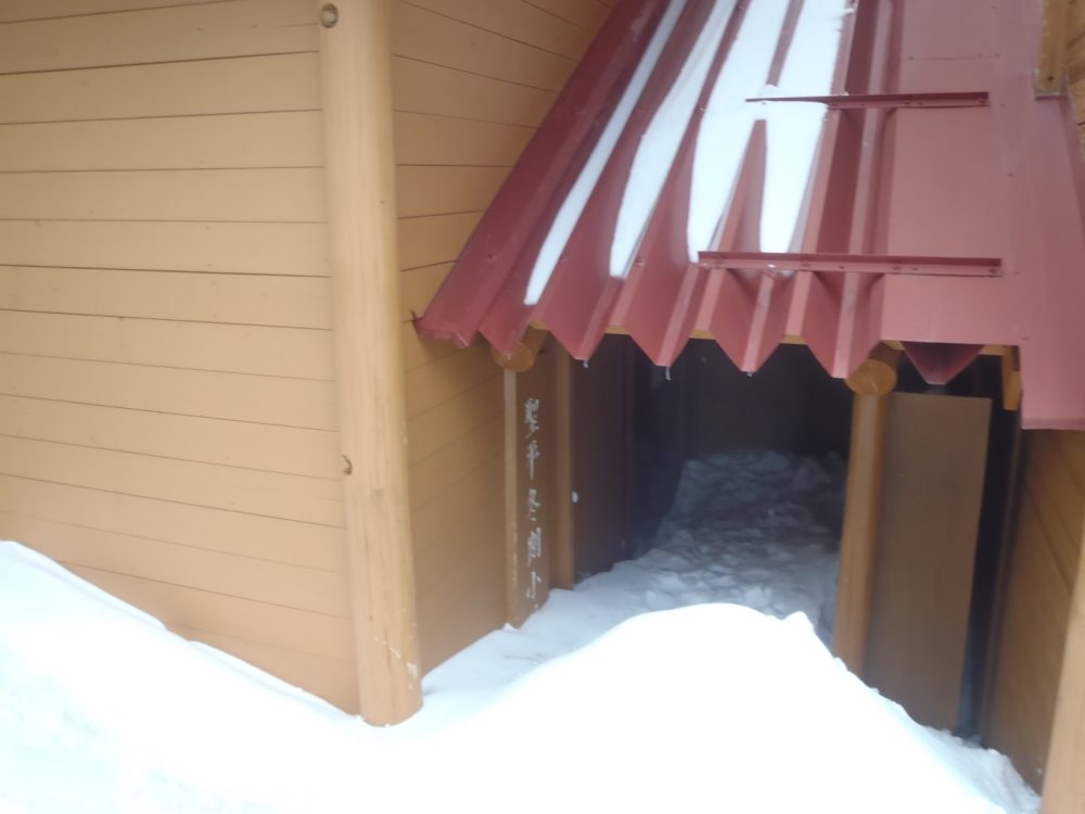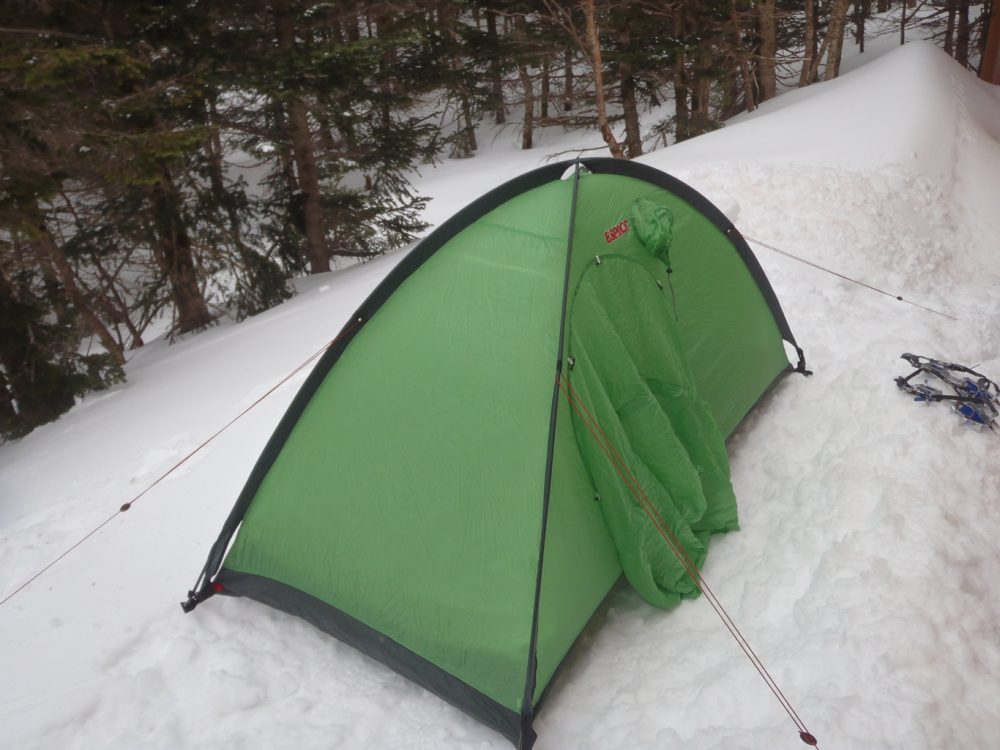冬季小屋は雪で扉が動かず。明るいうちにテントを張ります。