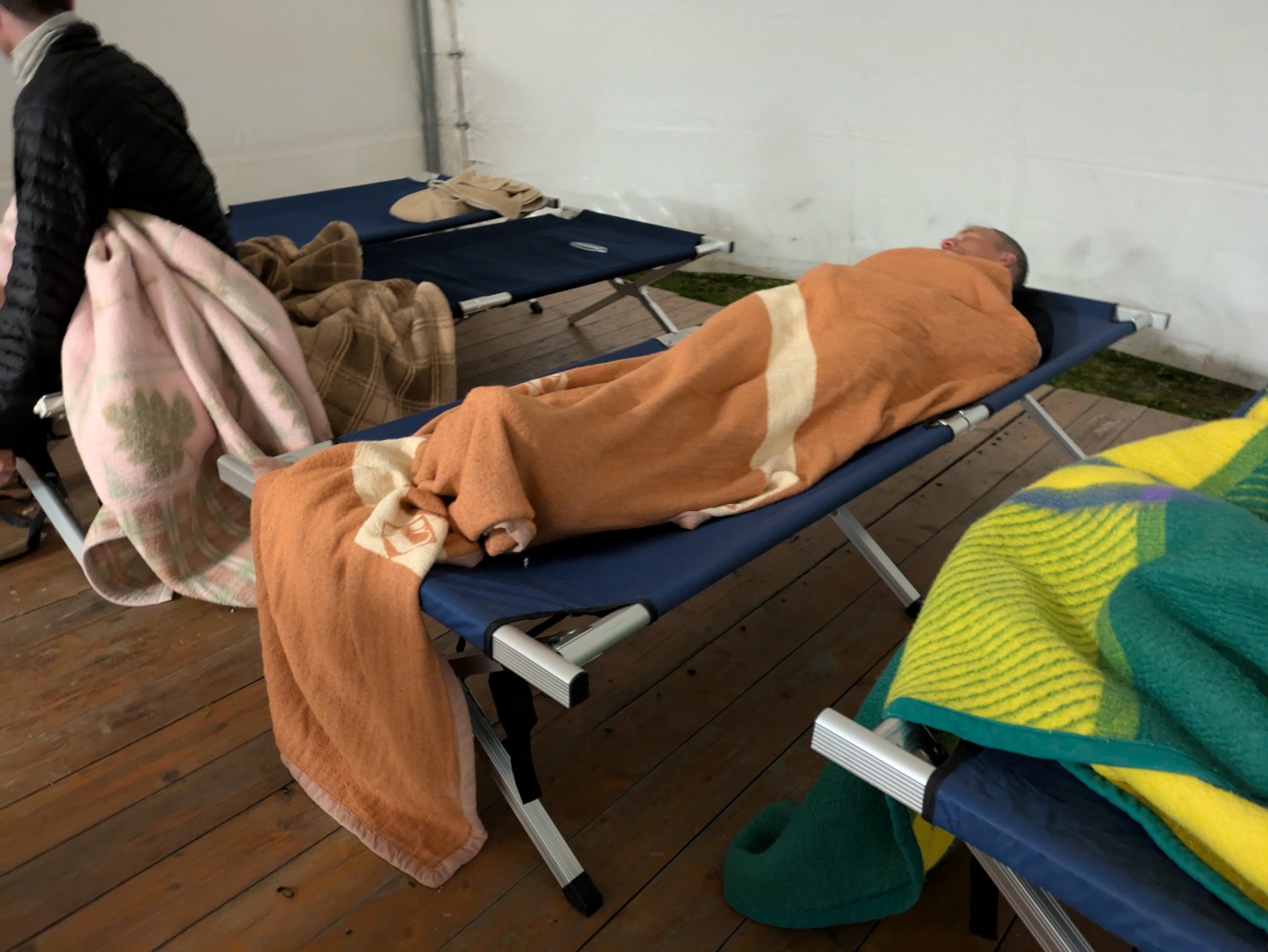 仮設テントエイドは、キャンプ用の簡易ベッドが6台あり、