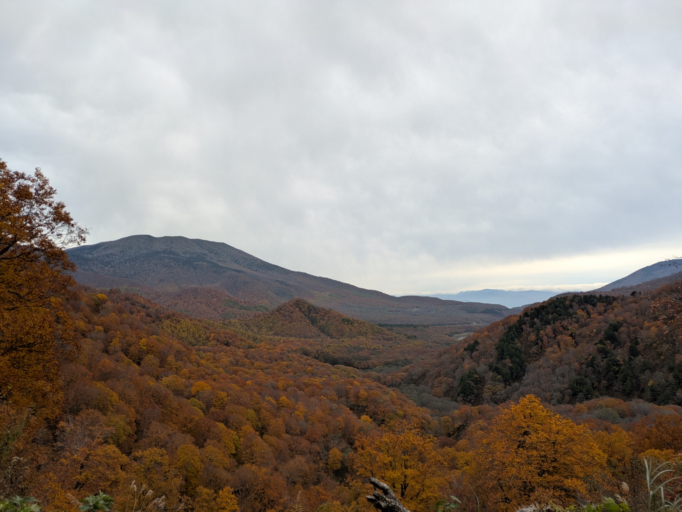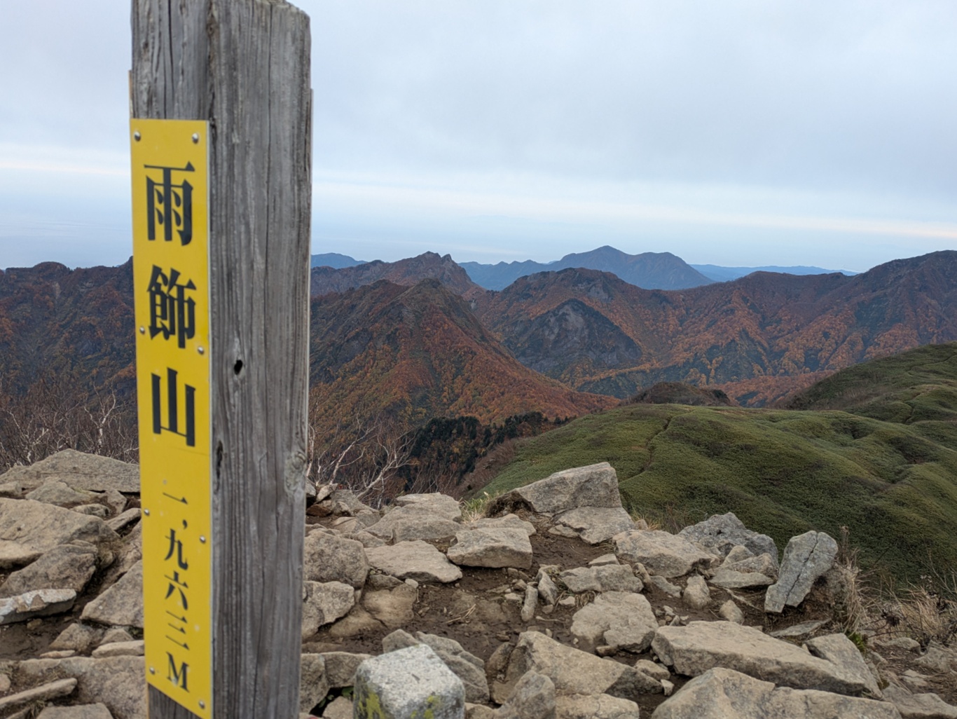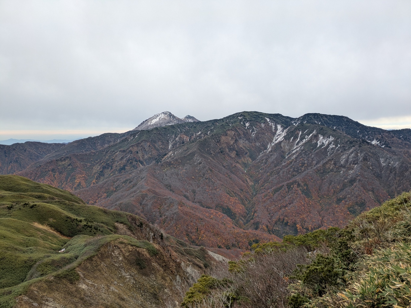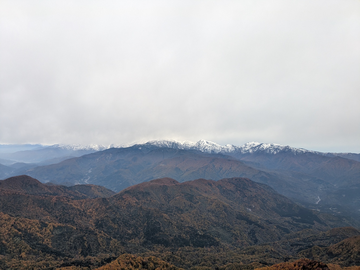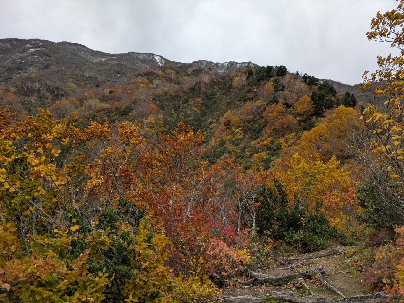 山頂からはすばらしい紅葉と、妙高山方面はかなり山が白くなっているのが見えます。