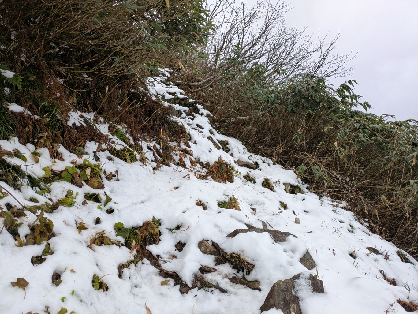 小谷からの登山道の合流直前はシャーベット状でチェーンスパイクがほしいところでした。