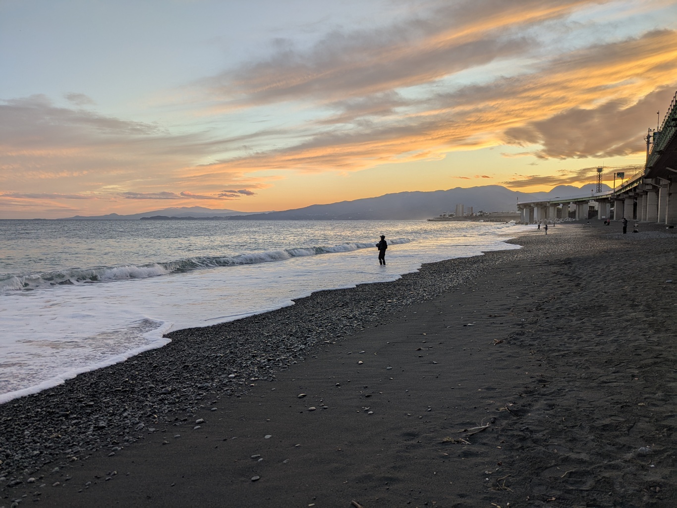 保育園の脇を通り国府津海岸には16時43分に到着、海釣りの方が多数。