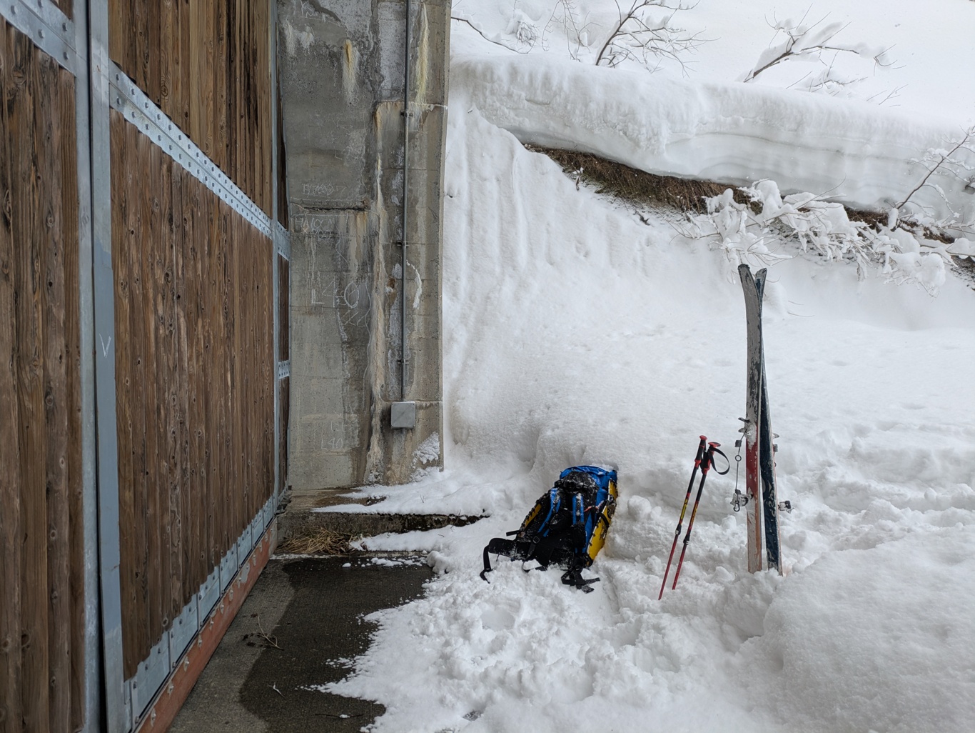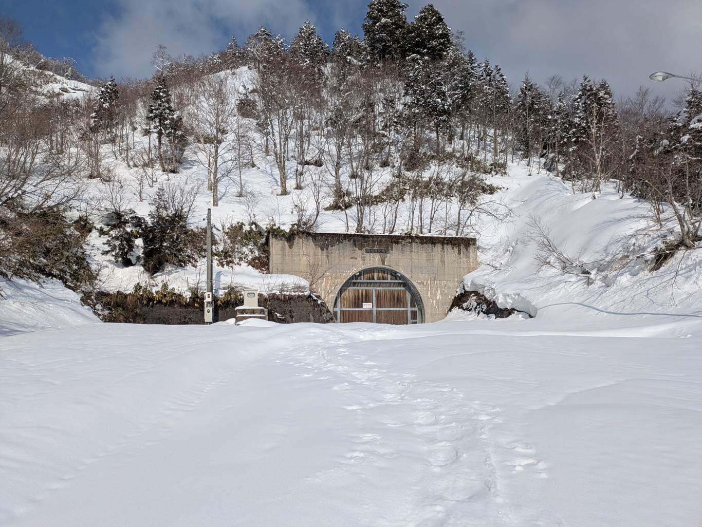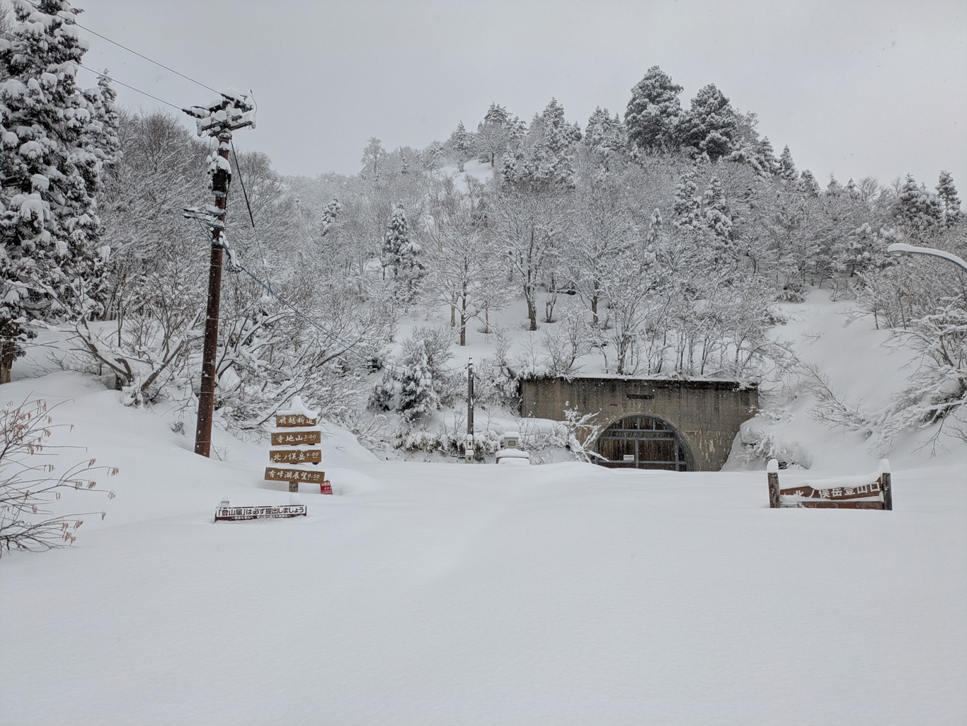雪が舞うなか林道を6kmスキーで歩き、3時間弱で飛越トンネルに到着。
