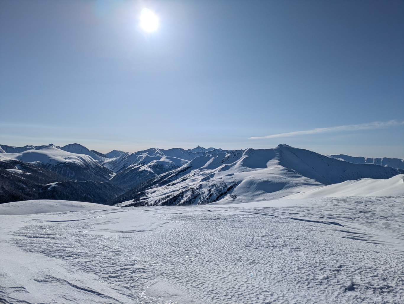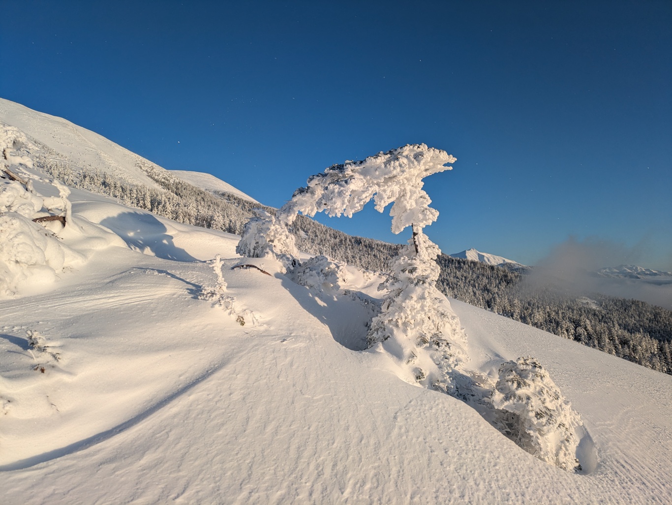 まぁまぁ板が沈むのでキツイのですが、昨シーズンは1日目1,600mのコルまでだったので順調。