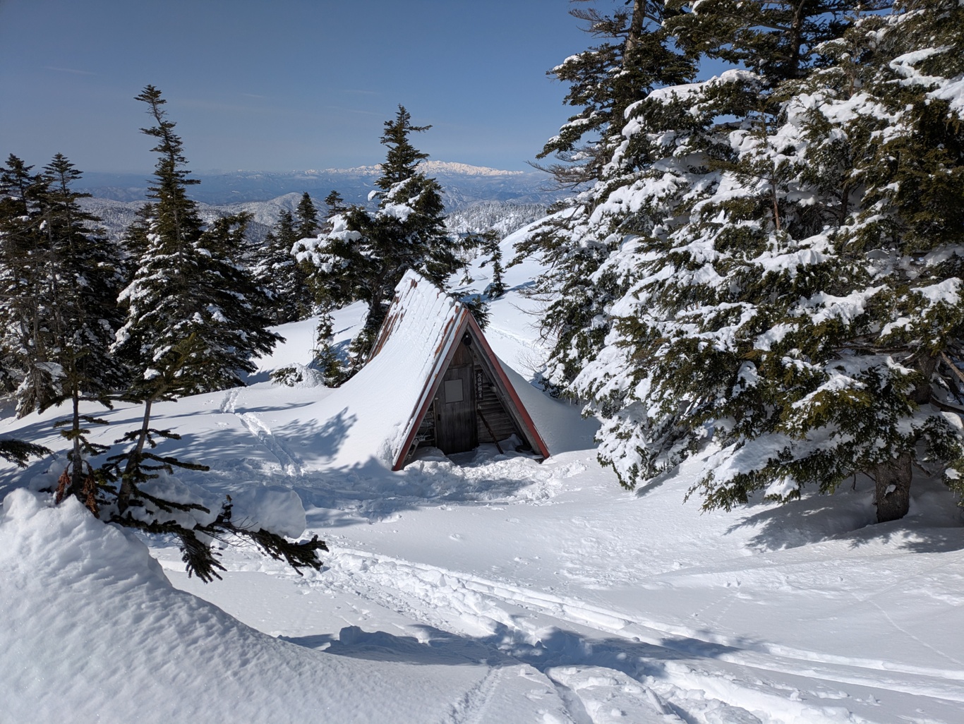 あっという間に標高差550mを滑り降り避難小屋に到着。