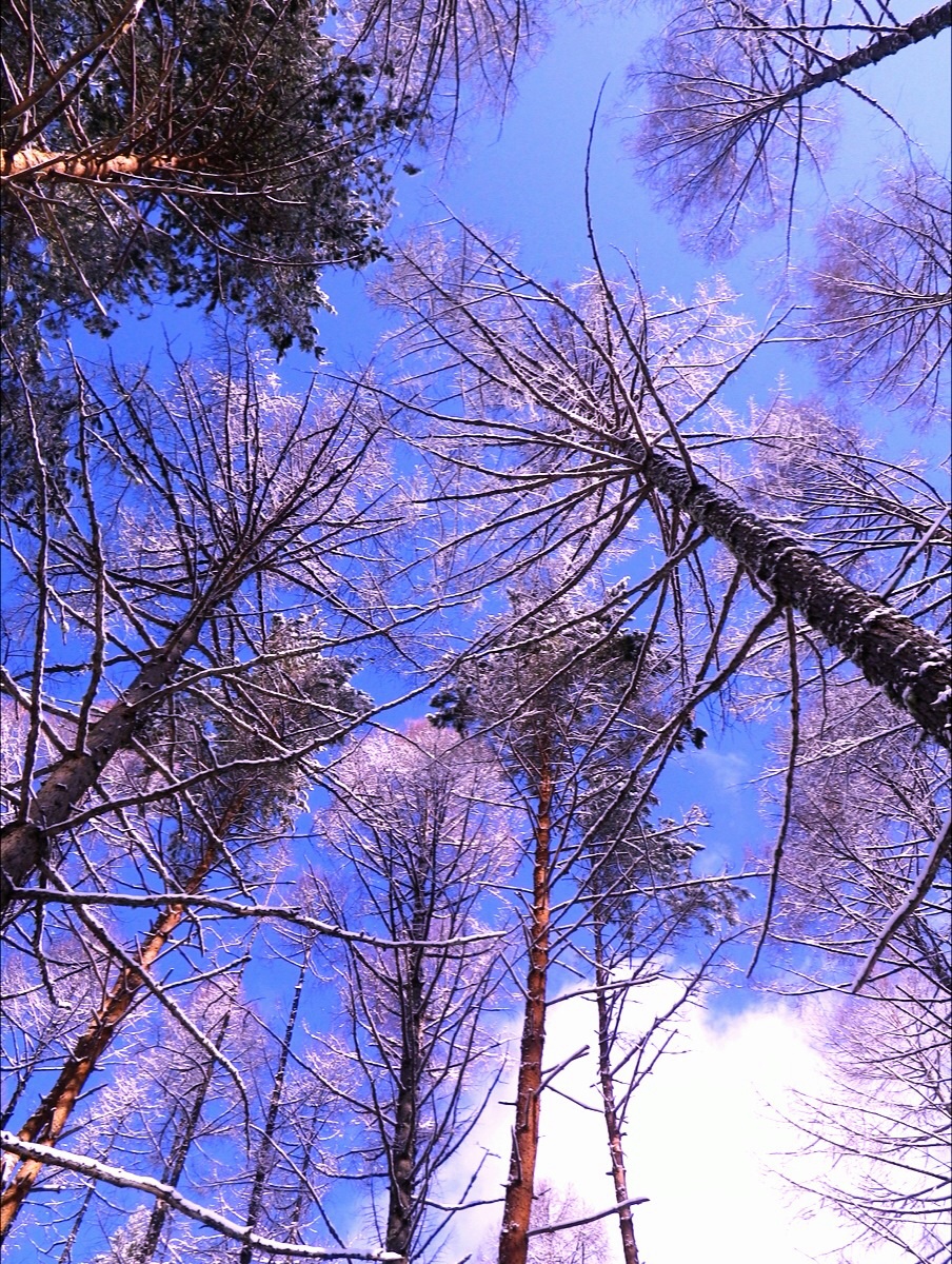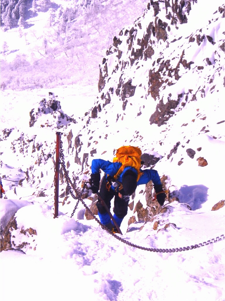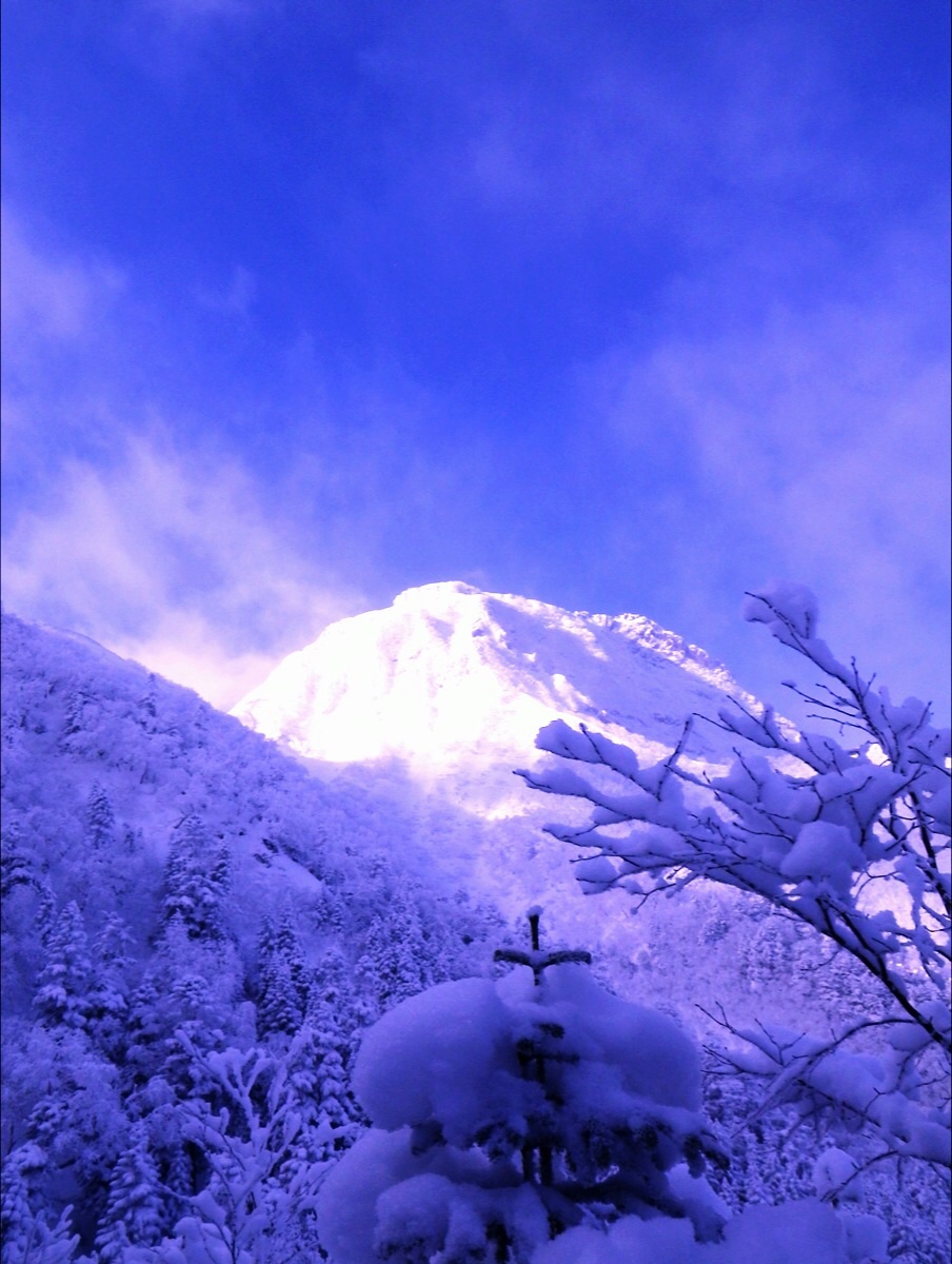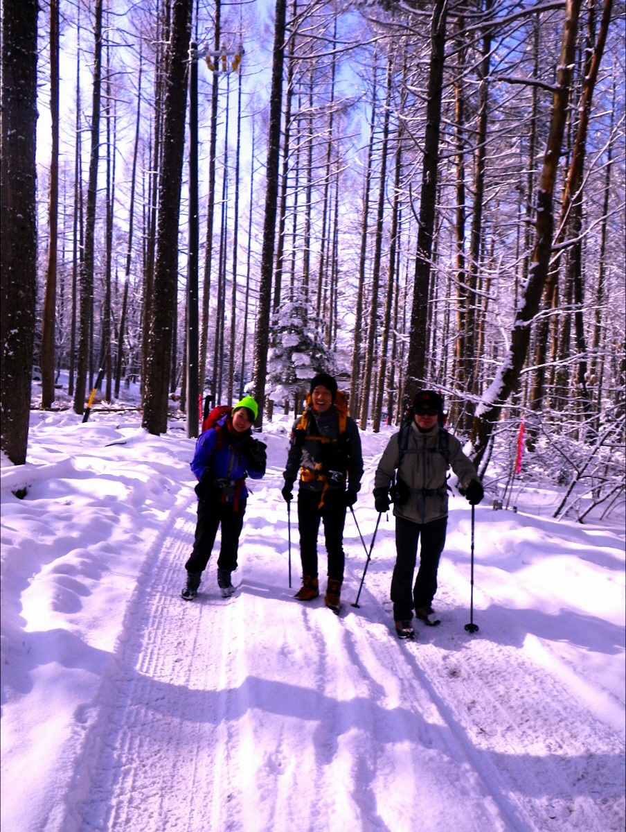 樹林帯を抜けると、少し風が当たる。この時、気温はマイナス16℃、後ろに横岳(?) が見える。