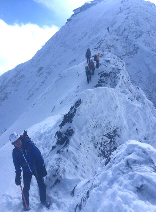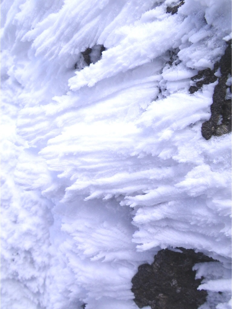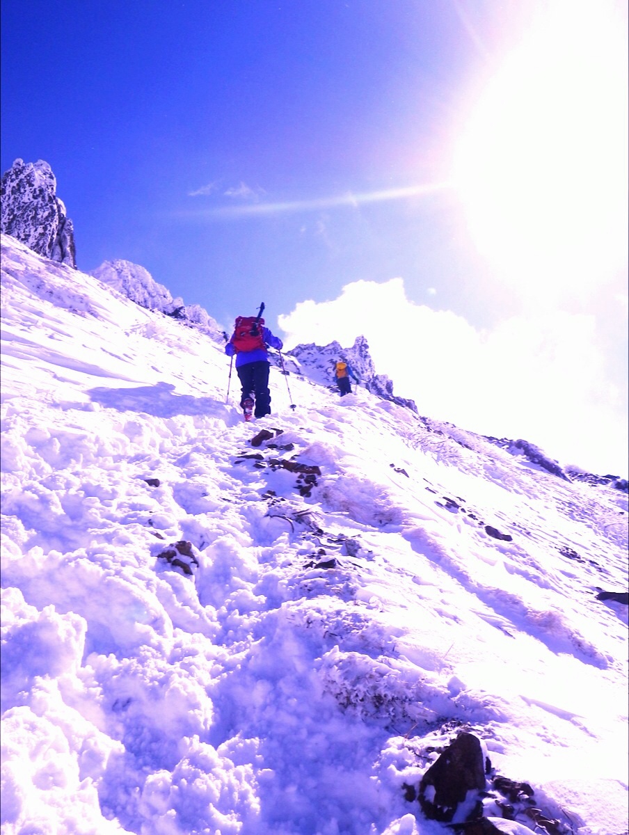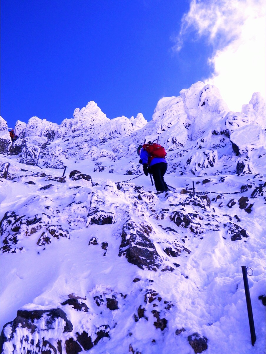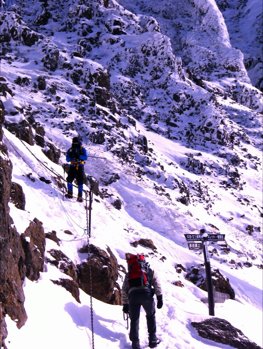 山頂から地蔵へと下る。風が強くて雪がつかず、アイゼンのかかりを確かめながら下る。