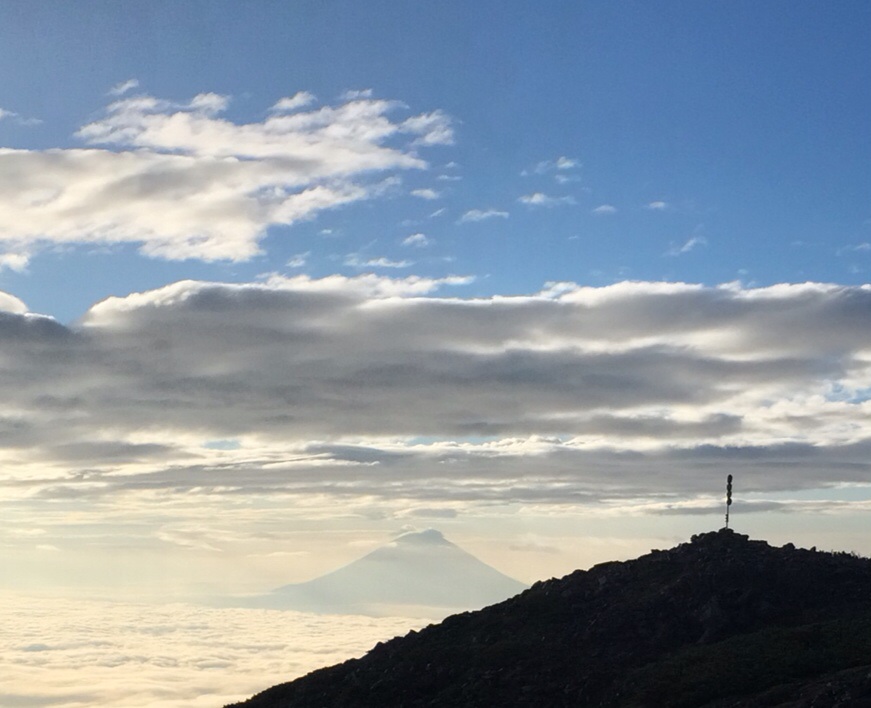 3日目下山の日の早朝、ご来光はガスがかかり見られなかったが、雲海に浮かぶ富士山と赤石岳ピークのコントラストが美しかった。