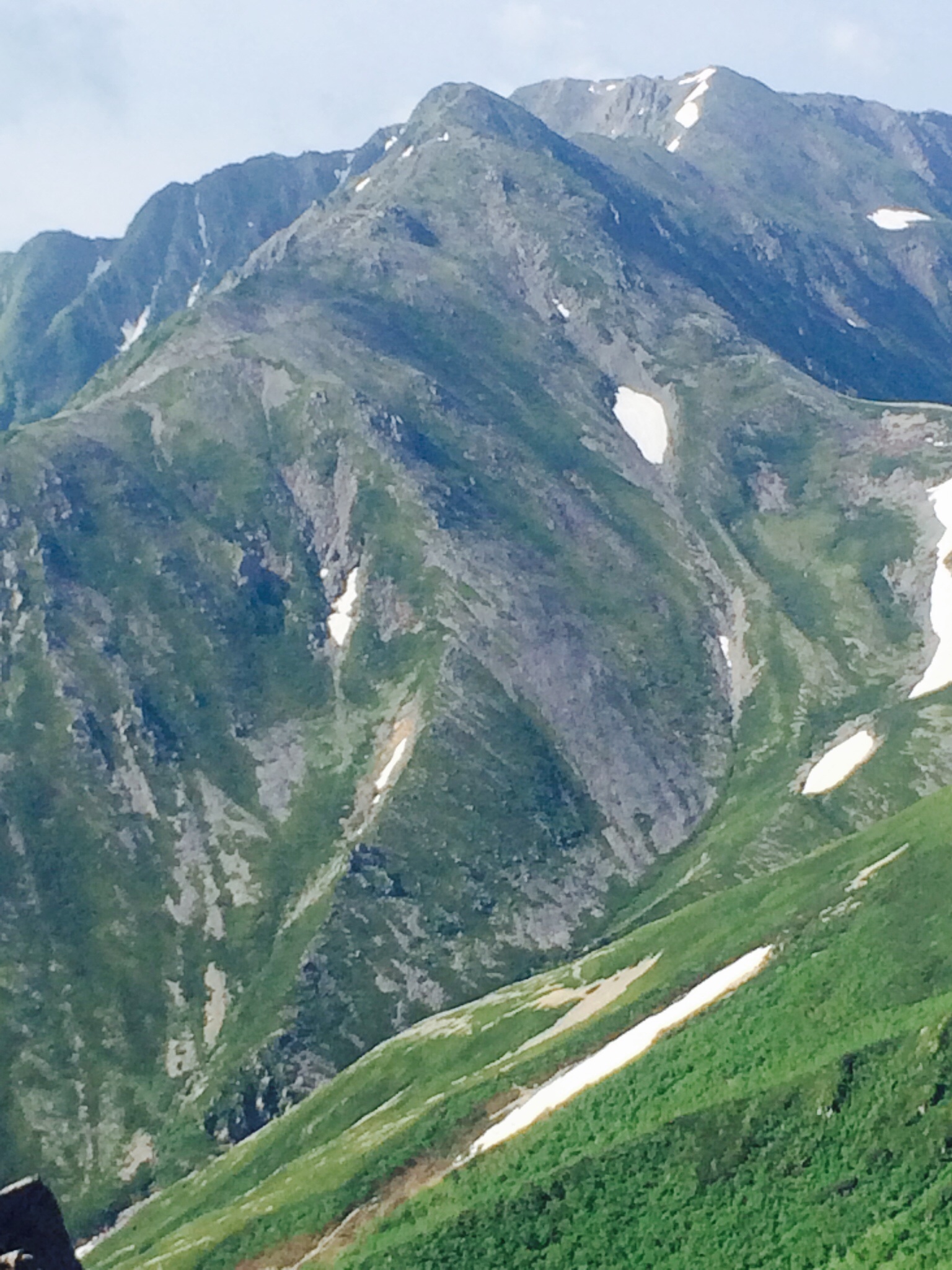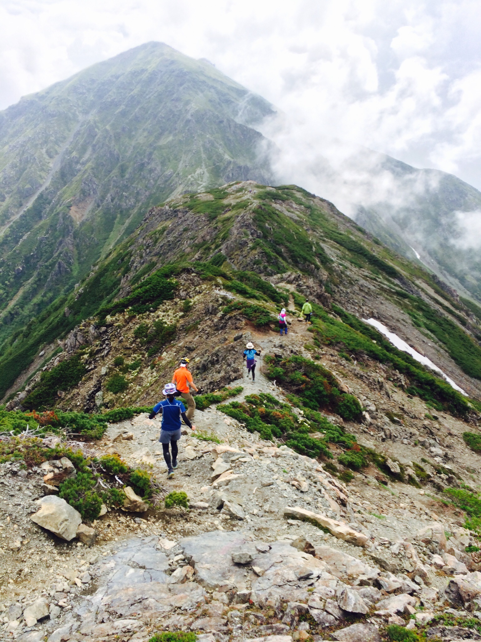 悪沢岳の手前、中岳避難小屋に荷物をデポさせていただいた。泊まりでもないのにデポはいかがなものかと戸惑っていたら、ご主人の方から声をかけていただいた。このご主人のスリムな身体、こけた頬のライン、もしかしてランナーでは?と思ったら、やはりトレイルランナーでした。トレーニングとして山を走っていると。TJARのお話で盛り上がりました。もちろん昼食休憩はここでいただく。また、昨晩、夜間走をしていたランナーの話を聞いた。ランナーのライトはルーメンが高いため、かなり遠くの山からでも確認ができる。自分たちと同じルートを動いていたが、なにかトラブルがあったか、中岳までくるのか、心配していたそうだ。当然アルプスの国定公園内では指定幕営地以外での幕営は禁止事項であり、また、テン場への到着時刻を考えるとあまり遅くなるべきではない。TJARという特殊なイベント時と、そうでない時を間違えてはならないと思う。我々はレース時や比較的安全な山域での夜間走には慣れるべきだし、TJARを目指す人にとっては一定標高以上のビバーク経験回数が書類選考基準となるわけですから、練習は避けられないわけですが、リスクと周囲への影響、そしてなにより自分の力量は考慮すべきでしょう。そうでないと「TJARかぶれ」と言われそうです(俺か!)