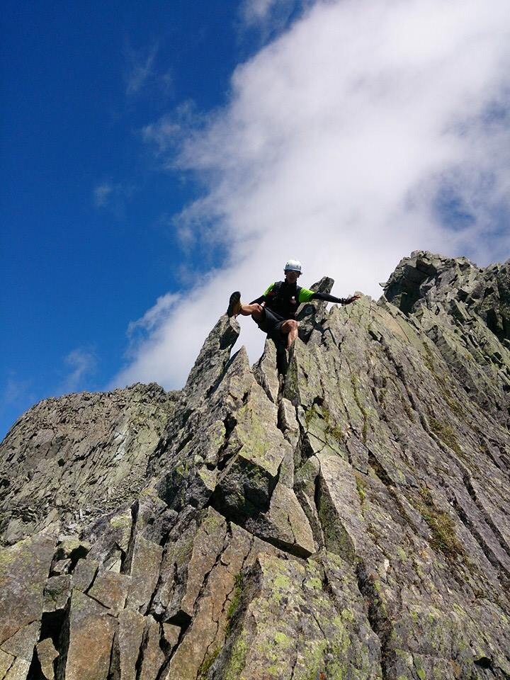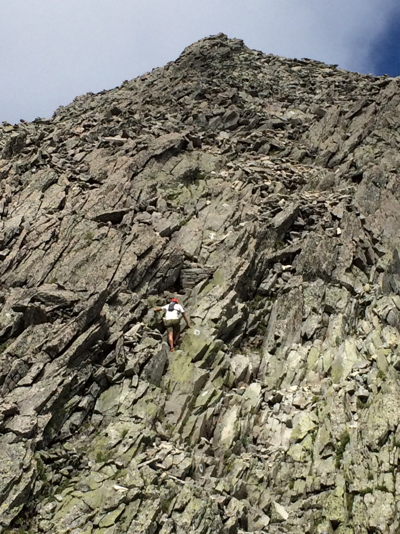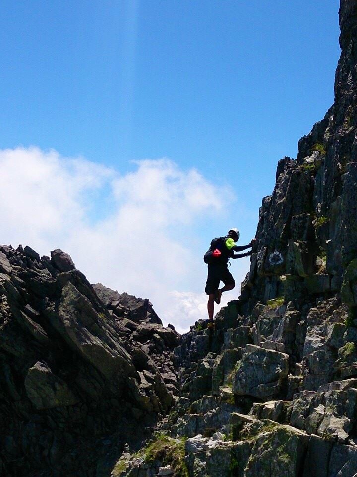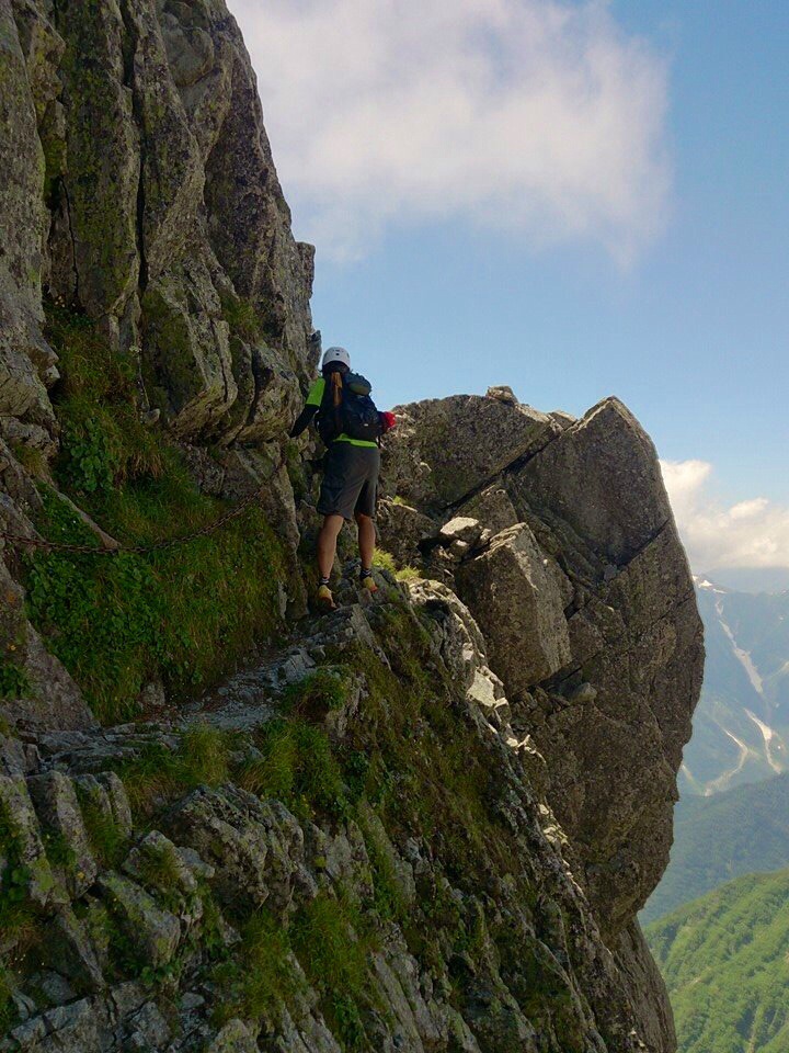 体力面、技術面ではボルダリングをやったことによって余裕度ができたと書いたが、具体的には、足場が限定される場合に、左右の足を踏みかえたり、手のホールドは上からつかむ(ガバ)以外にいろいろな取り方ができるようになっていること、そしてその余裕度から他の安全面に気を配れること。浮石、落石、同行者の様子、そしてなにより、自分自身が楽しい。必死にしがみつくだけだった昨年と比べると、一手一手を、楽に、安全にと考えながら登るのがとても楽しかった。そして、後から気づいたですが、写真を見ると、3点支持をできるだけいいバランスで保持しようとしている。上の写真は、右側が切り立ってはいるものの、靴幅2足分の幅は十分にあるトラバースなのですが、去年までなら、脚を楽に動かせるように、早めに片手は岩から離していると思う。今年は無意識のうちにボルダリングのトラバース課題のような感覚を持っていて両手を岩から切っていない。手前に鎖が写ってはいるが、鎖を使わず、易しいトラバース課題を登るような感覚を持っていたのでこういう写真になっていると思う。上に、クライミングやボルダリング技術は必要ないと書いたが、ただ登頂するだけなら必要はなくても、より安全に、楽しく登るならば身に付けておくとよいでしょう。