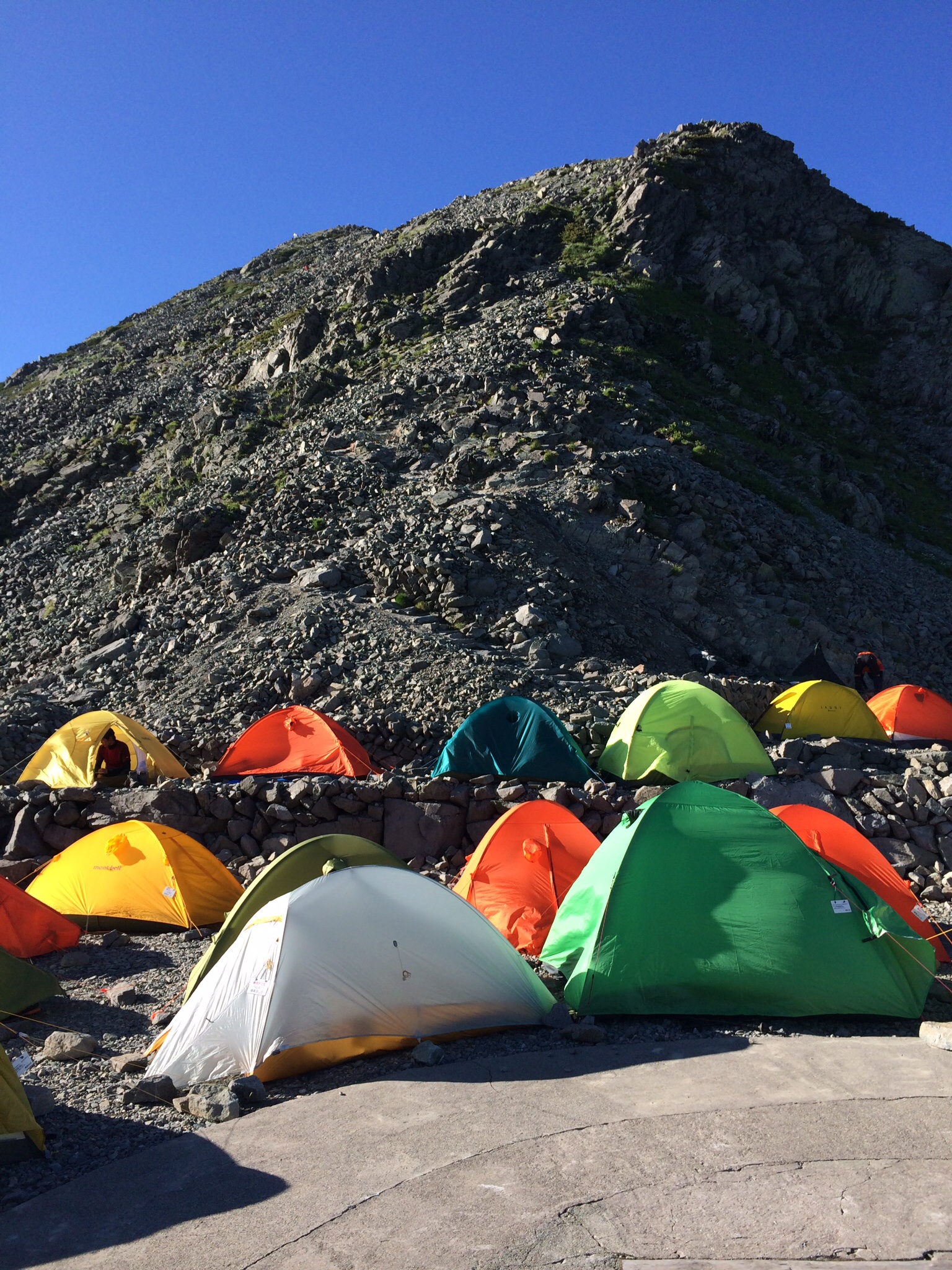 OMMへのエントリ―が決まってから、ツエルト泊への意識が高まった。今回もツエルトかテントか迷ったが、ツエルト初心者の自分には、3000mクラスの稜線はちょっとまだ早いなと思い、UL系のテントを選択した次第。以前に、もう少し重量感のある山岳系ソロテントで暴風雨の中、一晩過ごしたことがあったが、今回のUL系テントの風に対する強度をテストをする良い機会となった。結果は良好! ネット上では、フレームが折れるなどのトラブルも報告されているが、多少の個体差や張り方にもよることだろう。ツエルトの軽さもいいが、テントの安心感を再認識した次第。
