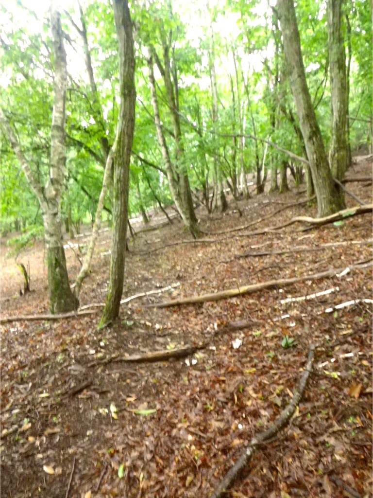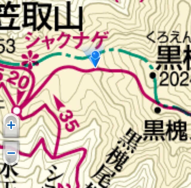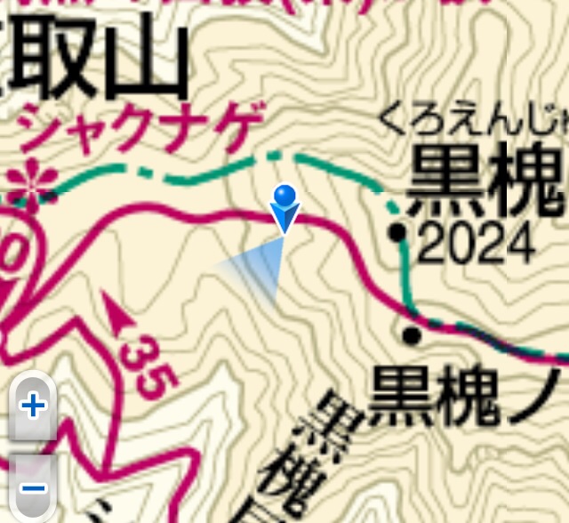 つまり、最初に不安に感じて確認したGPSの軌跡は誤差かアプリのバグか?よく考えてみると、その確認したポイントの地形は、明らかに黒槐(くろえんじゅ)へのピークへ登る傾斜(県境に沿って)ではなく、 等高線に沿ってピークを巻きながら、ほぼ水平に移動するものだった。つまり地図と合致する。GPSを過信し、地図読みを怠ったことで結構な時間、薮の中の複数のトレースをうろうろしてしまった。GPSはあくまでもに二次的な確認にのみ使うものとし、紙の地図をきちんと整置して読むべしということを身を持って経験したことになる。登山用のGPSならもっと精度は高いのでしょうが、スマホのアプリ程度に命は預けられませんね。バッテリーが切れればそれで終了ですし、もちろんOMMでは使用不可。レベルの低い初歩的なお恥ずかしいミスで、書こうかどうか迷いましたが、悪い見本としてご参考にしていただければと思います。