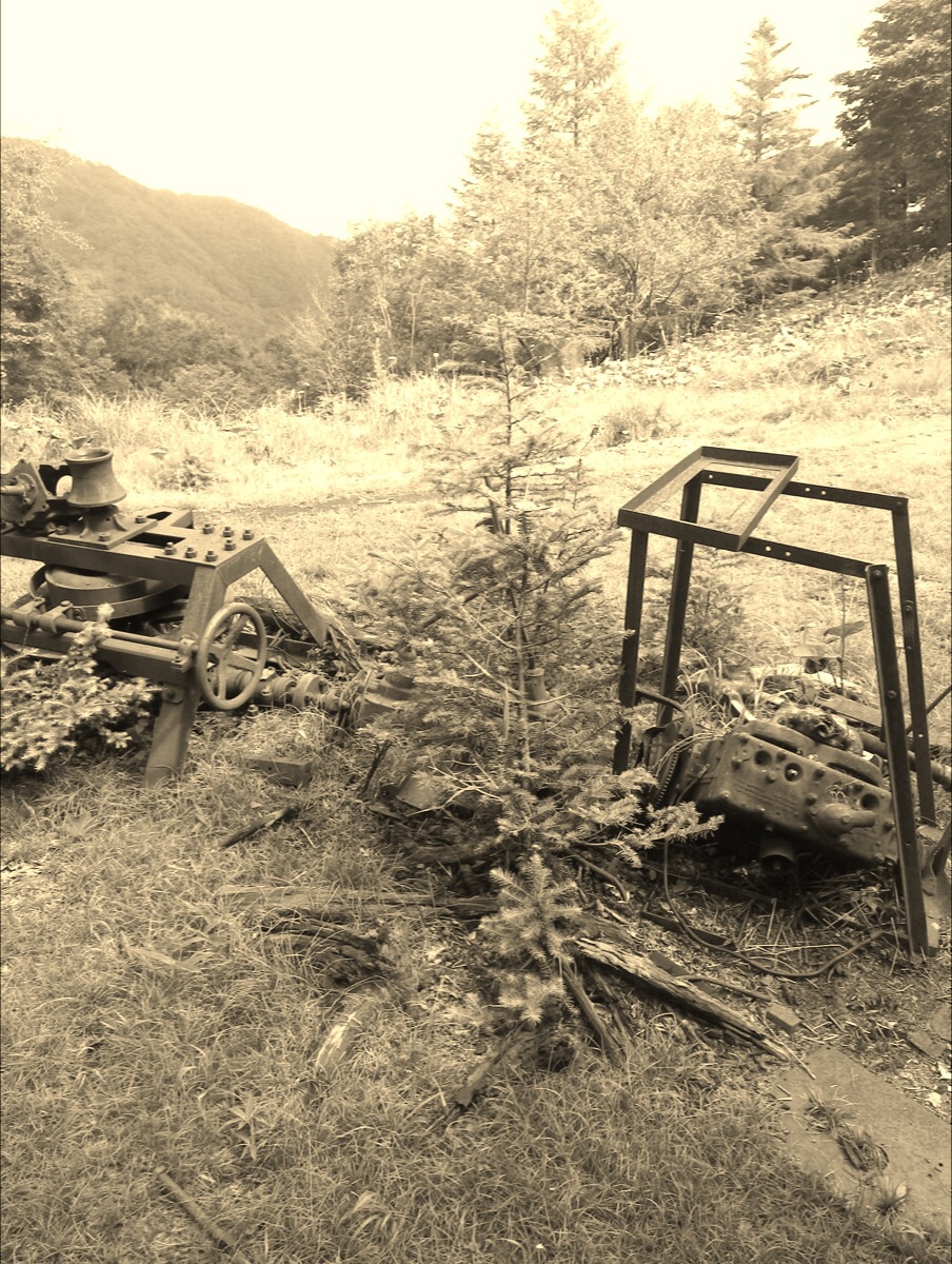 時間が止まったような林業者の廃工作機械。戦後の木材需要と歴史の一端を垣間見る。