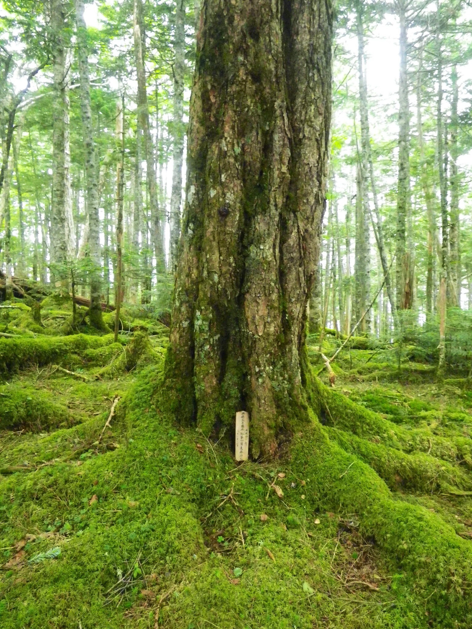 写真の木はお札が置いてあるので、ご神木だろう。撮らせていただきますと手を合わせて写した1枚。後ろに苔むす倒木がたくさん見えるが、大弛小屋のオヤジさんの話だと、50年ぐらい前に倒れた倒木がもうそろそろ土に帰ろうとしている頃だと。登山道整備の時も、美しい倒木は切らないそうだ。