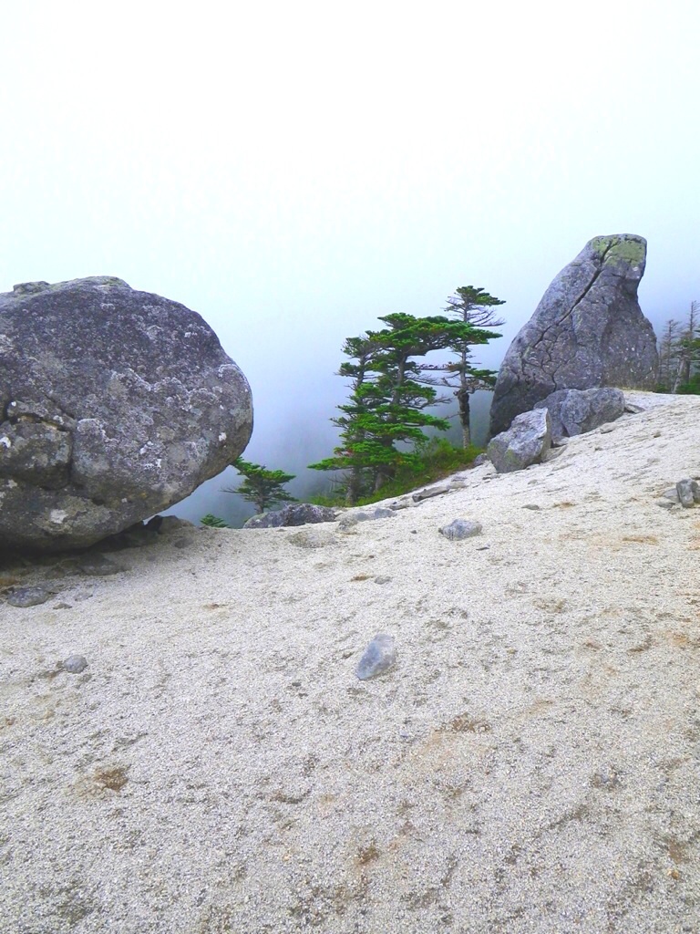 甲武信ヶ岳(2,380m)に向けて高度を上げると、白浜に岩が並ぶ庭園のような風景、プチ鳳凰三山のような景色の賽ノ河原(さいのがわら)に着く。ガスが覆い、明日の天候が荒れる予感(泣)